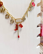 Make a bold statement on Razorback game day with the custom, one-of-a-kind Show Stopper Woo Pig Charm Necklace. Designed and assembled by Emily, this striking piece features 14 carefully selected charms for a truly show-stopping look. A gold-based carabiner sits at the center, accented with perfect touches of red, combining elegance and team spirit in one unforgettable accessory.