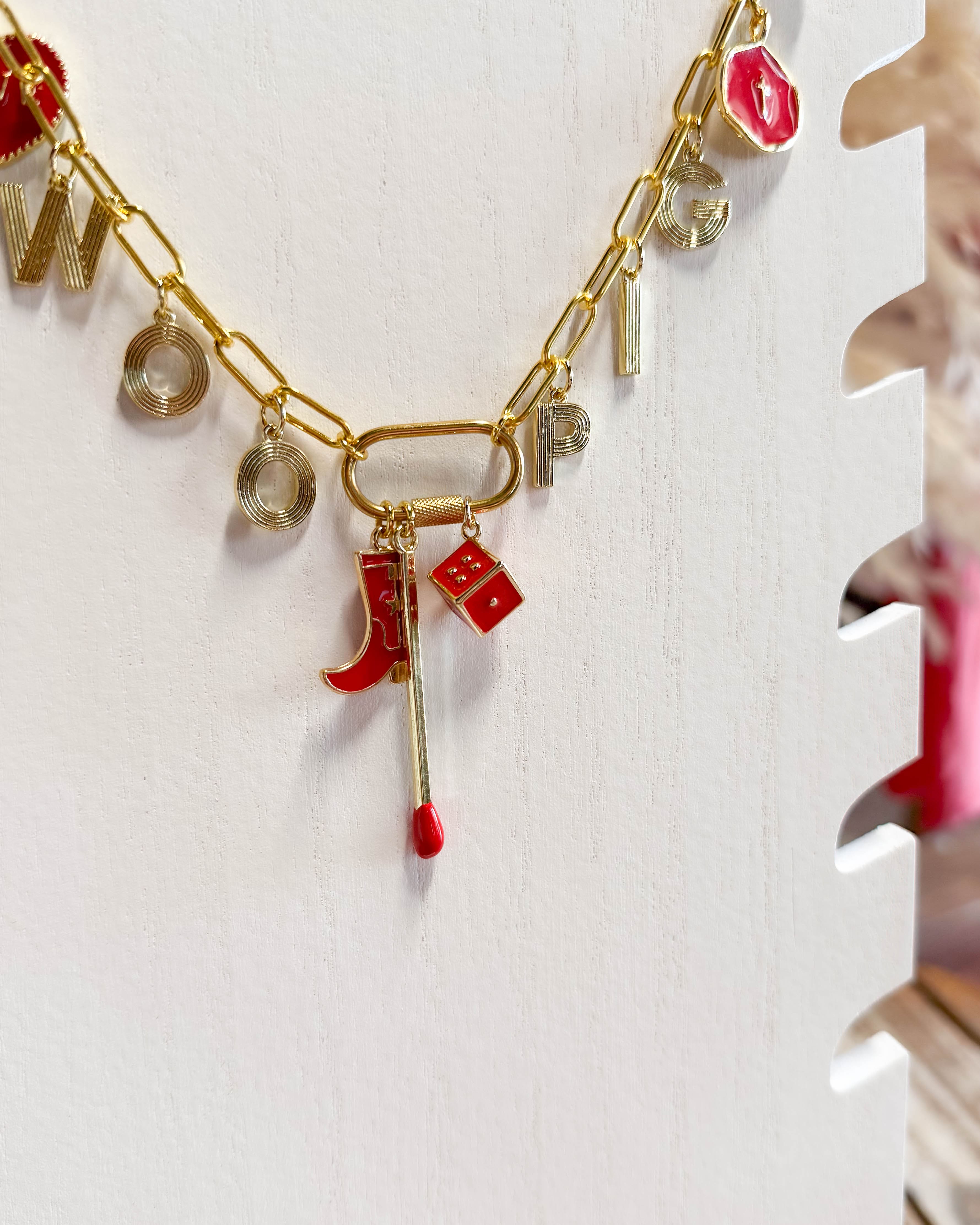 Celebrate your Razorback pride with the custom, one-of-a-kind Gold Hogs Charm Necklace. Designed and assembled by Emily, this necklace features textured hogs letters paired with fun red charms, making it the perfect accessory for game day. Show your team spirit with a unique piece that combines bold style and heartfelt fandom.