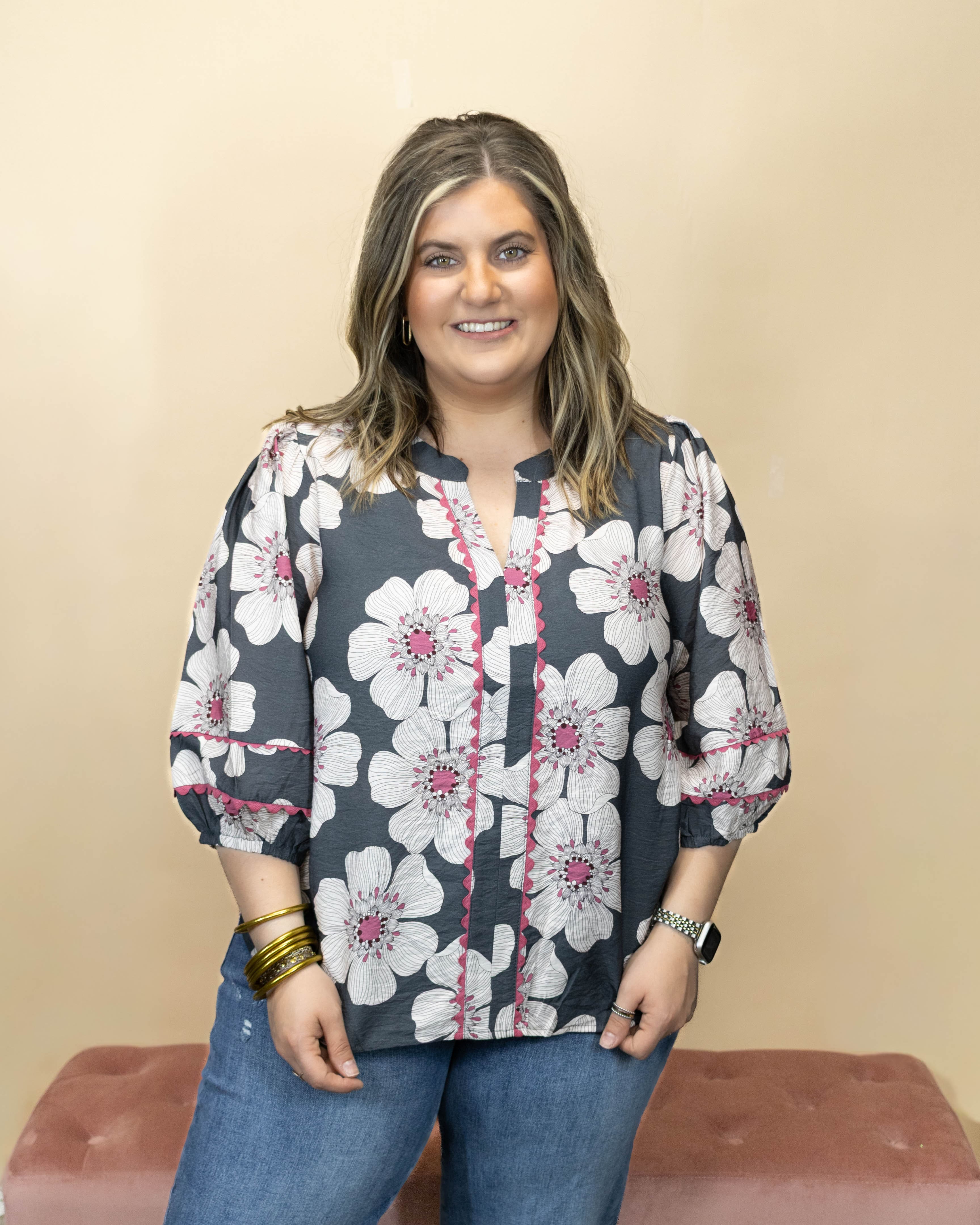 The Always In Sight Top combines charm and style with its delicate pink flower print and flattering three-quarter sleeves. Perfect for any occasion, this top adds a fresh, feminine touch to your wardrobe while ensuring comfort throughout the day. Elevate your look effortlessly with this cute and fashionable essential.