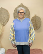 Brighten your wardrobe with this charming yellow and blue striped sleeve top, featuring playful details that add a touch of fun to your everyday look. Perfect for casual outings or layering, its vibrant colors and unique design make it a standout piece you'll want to wear again and again.