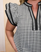 This top is a classic black and white gingham, featuring adorable ruffle sleeves that bring playful flair to any outfit. Wear it casual with your favorite jeans, or dress it up for something more polished.