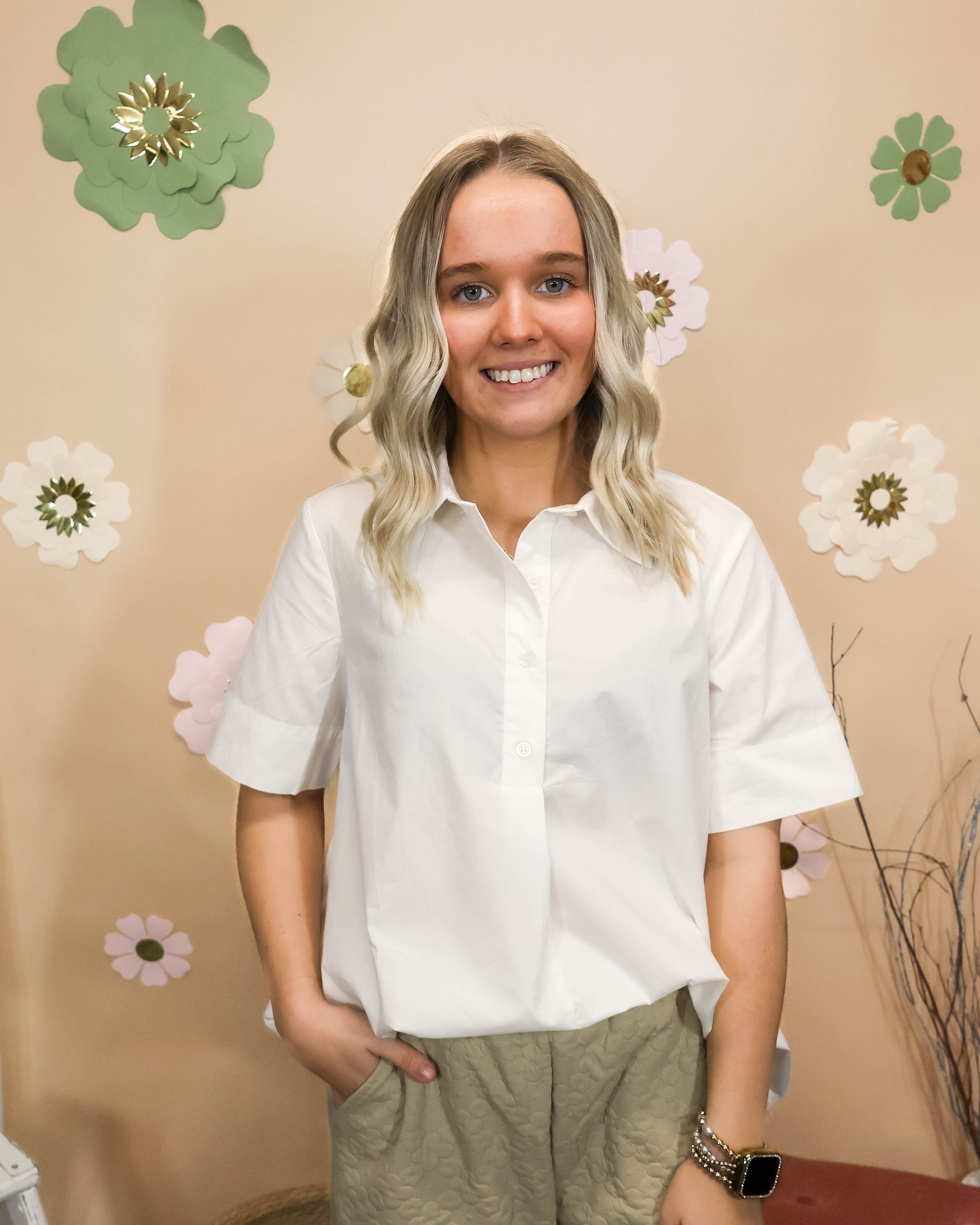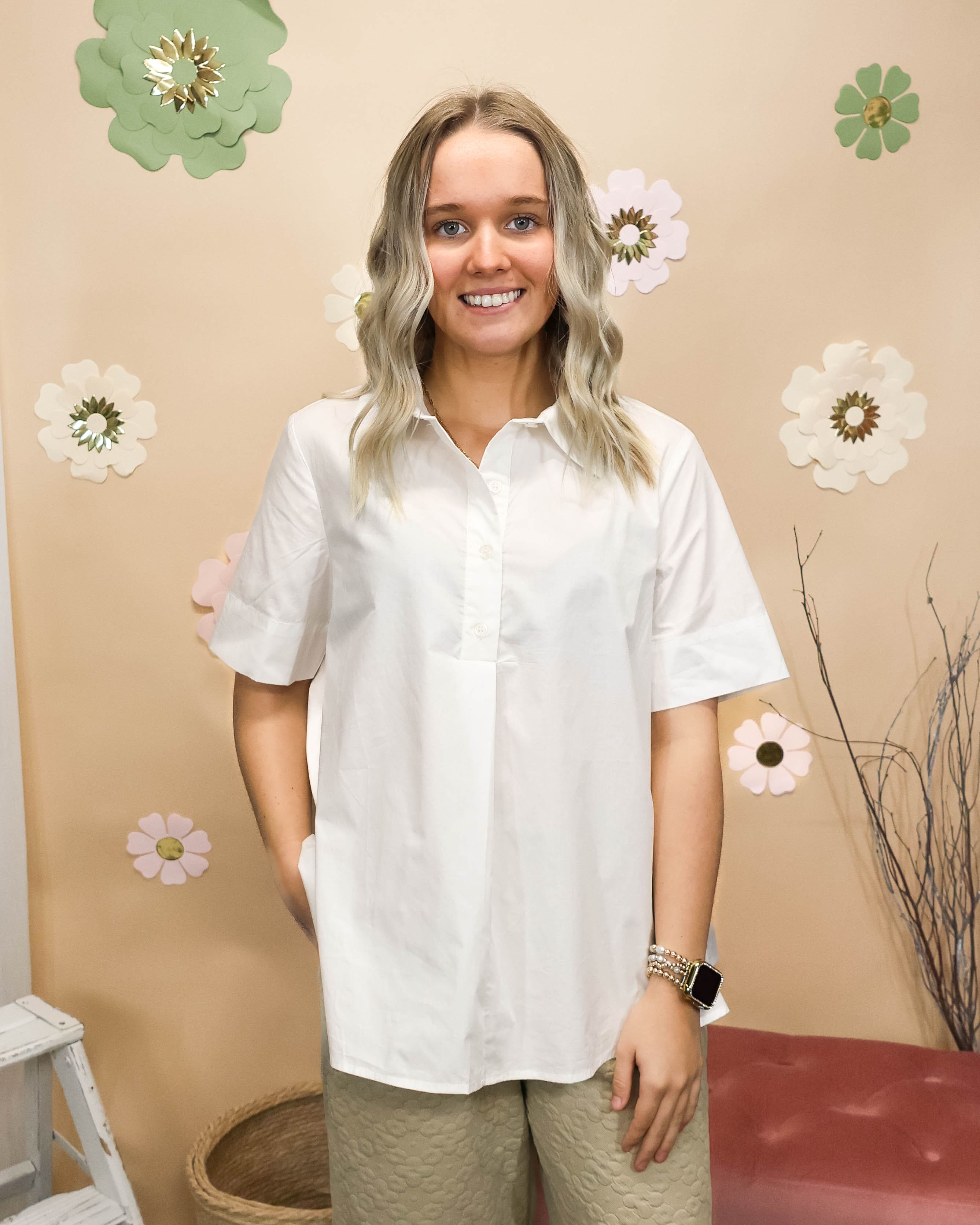 Elevate your wardrobe with this sophisticated white button-up top, designed for effortless elegance. Featuring a crisp collar neckline and graceful pleated detailing, this piece combines structure with movement for a flattering silhouette. The flowy fabric drapes beautifully, making it perfect for both professional settings and dressed-up occasions. Versatile and timeless, it pairs seamlessly with tailored trousers, skirts, or jeans for an instantly polished look.