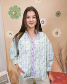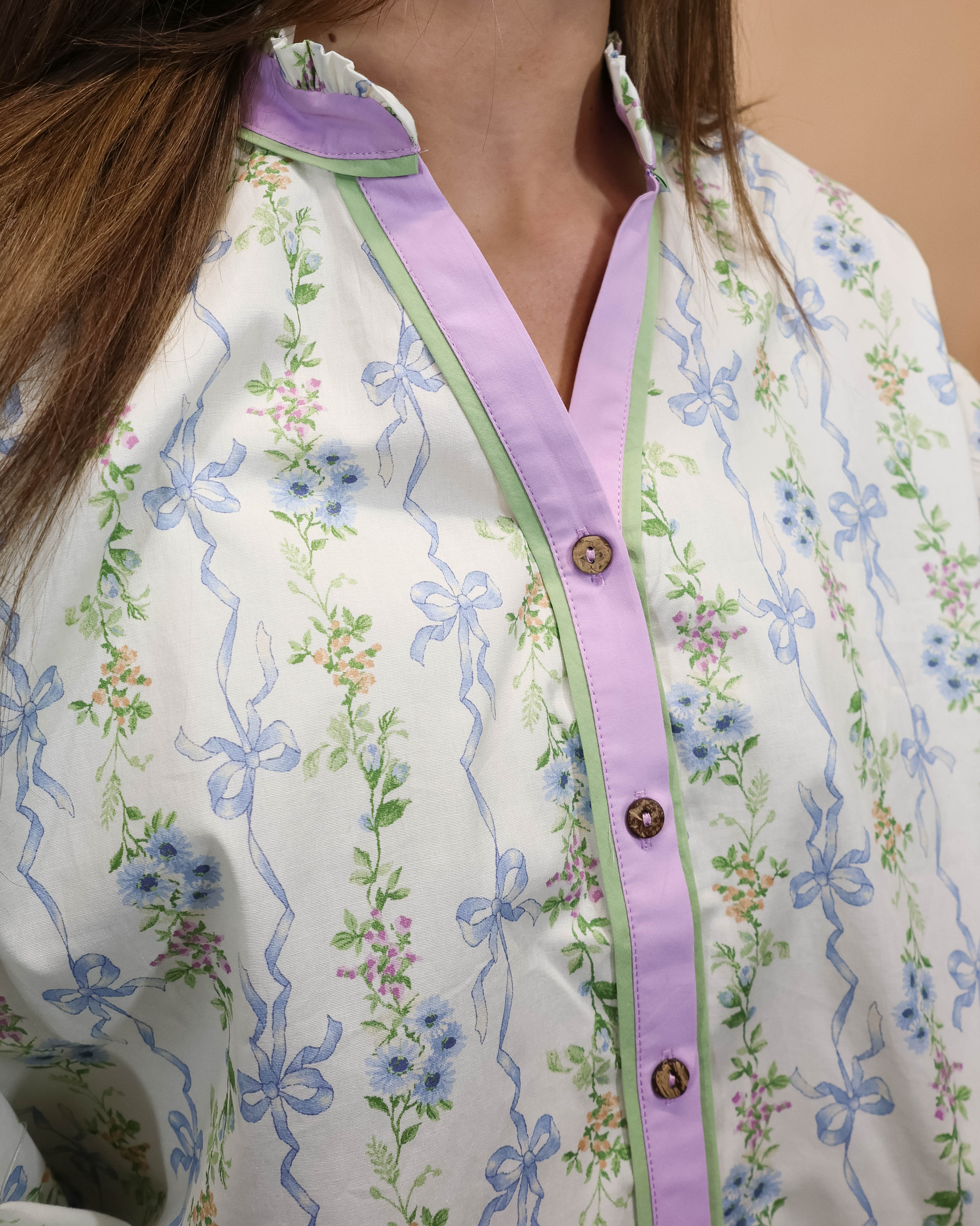 This dressy top features a charming bow detail and a beautiful floral print in cheerful spring colors. Perfect for special occasions or spring time casual looks, it brings sophistication and personality to your wardrobe.