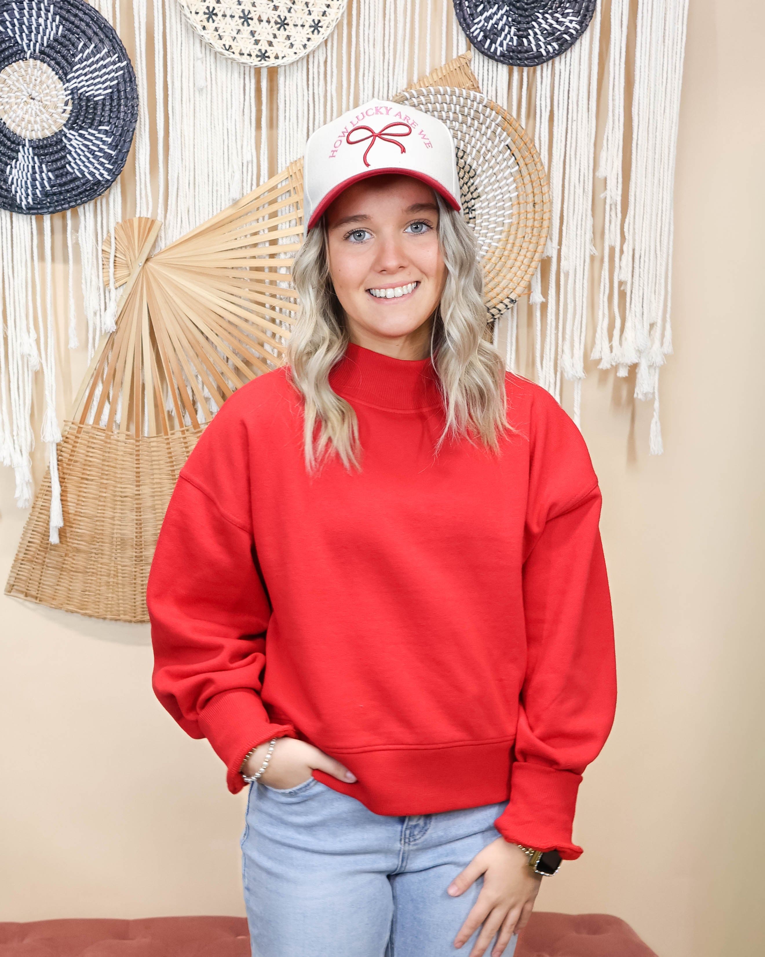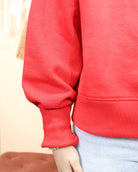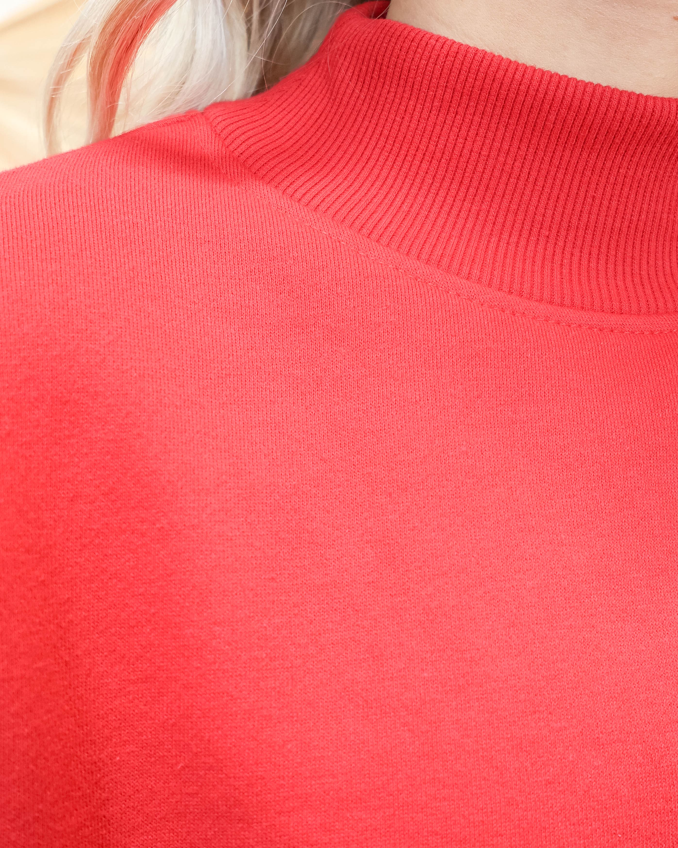 Go bold in this bright red cropped mock-neck sweatshirt that's all about comfort without compromising on style. The vibrant hue makes a statement while the relaxed fit keeps you feeling cozy and at ease. Pair it with high-waisted bottoms to show off the cropped silhouette, or layer it under an open shirt for extra dimension. Whether you're running errands or hanging with friends, this sweatshirt proves that casual can absolutely be cool.
