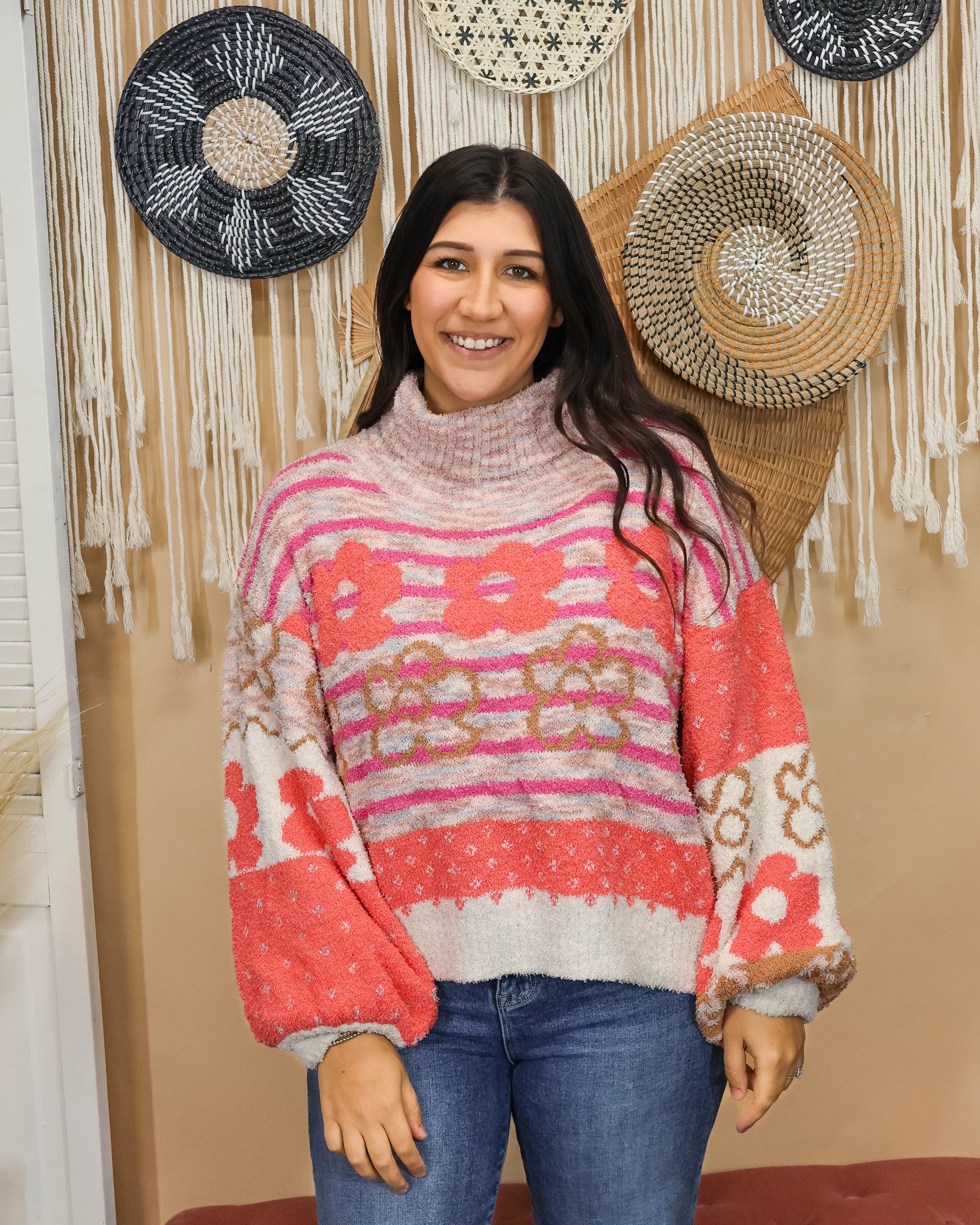 How fun is this sweater? Featuring a floral print and vibrant colors, this sweater is soft and cozy, but adds a fun look to your wardrobe!