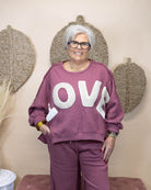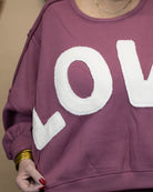 This charming purple sweatshirt showcases the word "love" beautifully woven into its design, making it a perfect blend of comfort and heartfelt style. Soft and cozy, it’s ideal for adding a touch of warmth and positivity to your everyday look. Embrace both comfort and a meaningful message with this must-have sweatshirt.