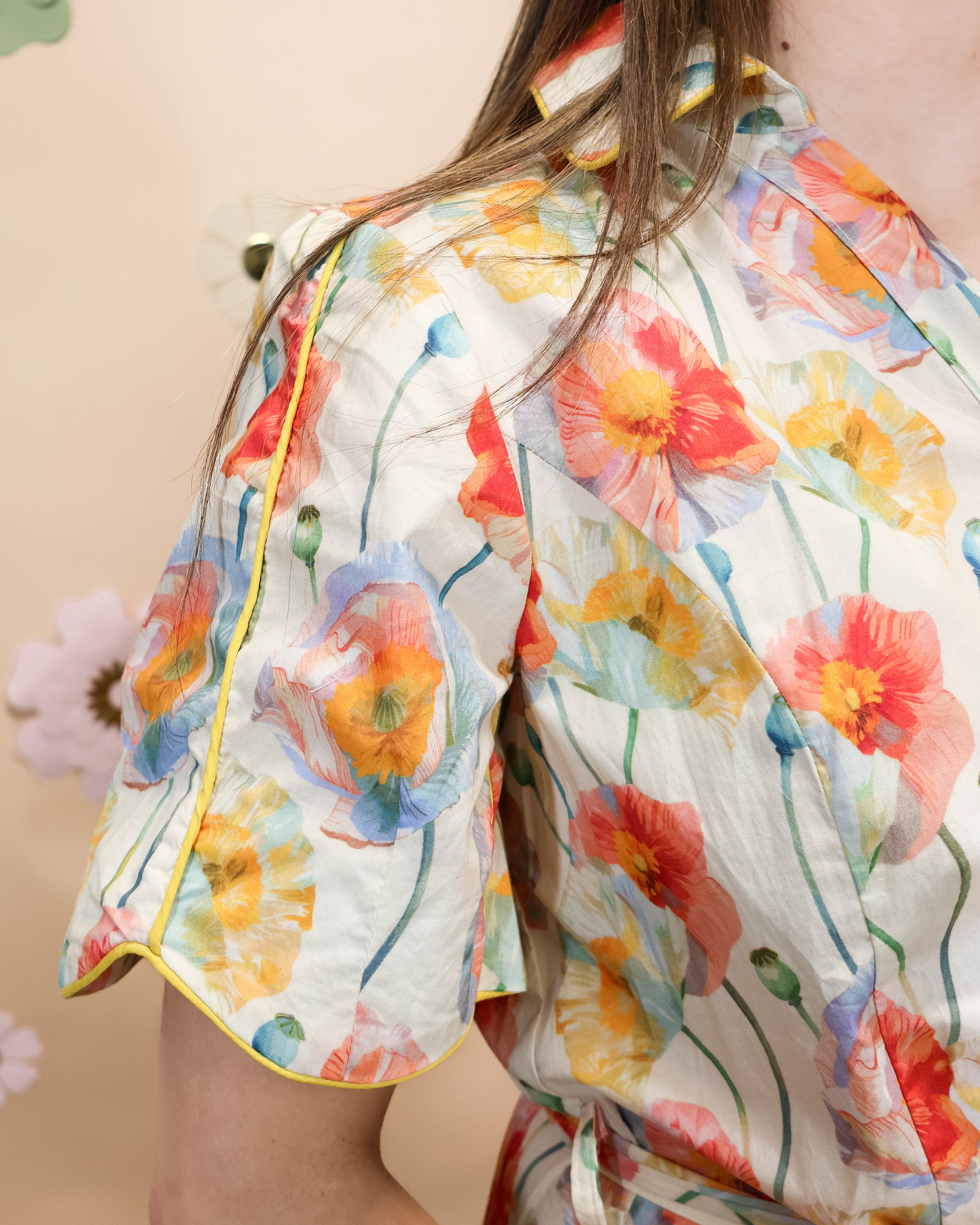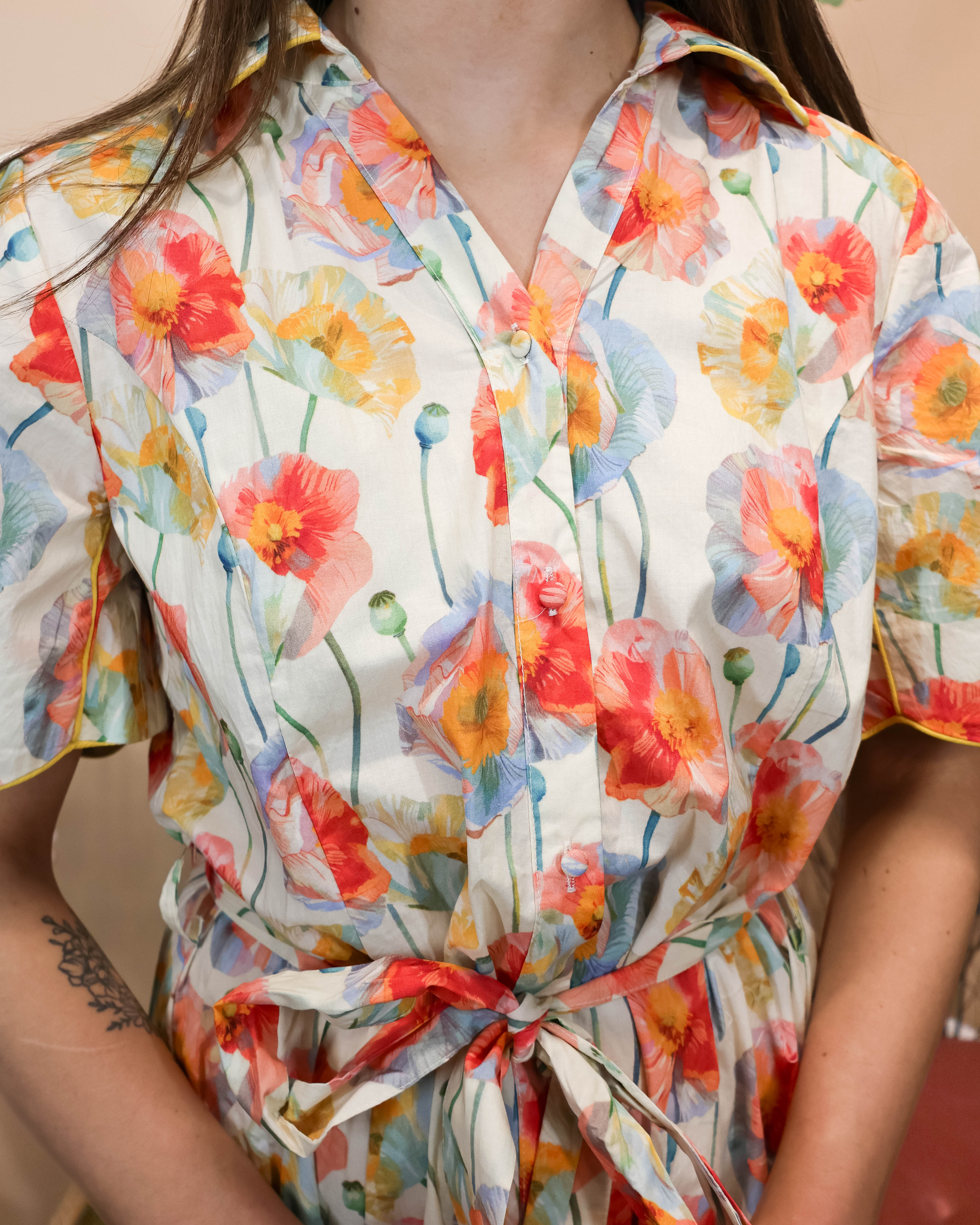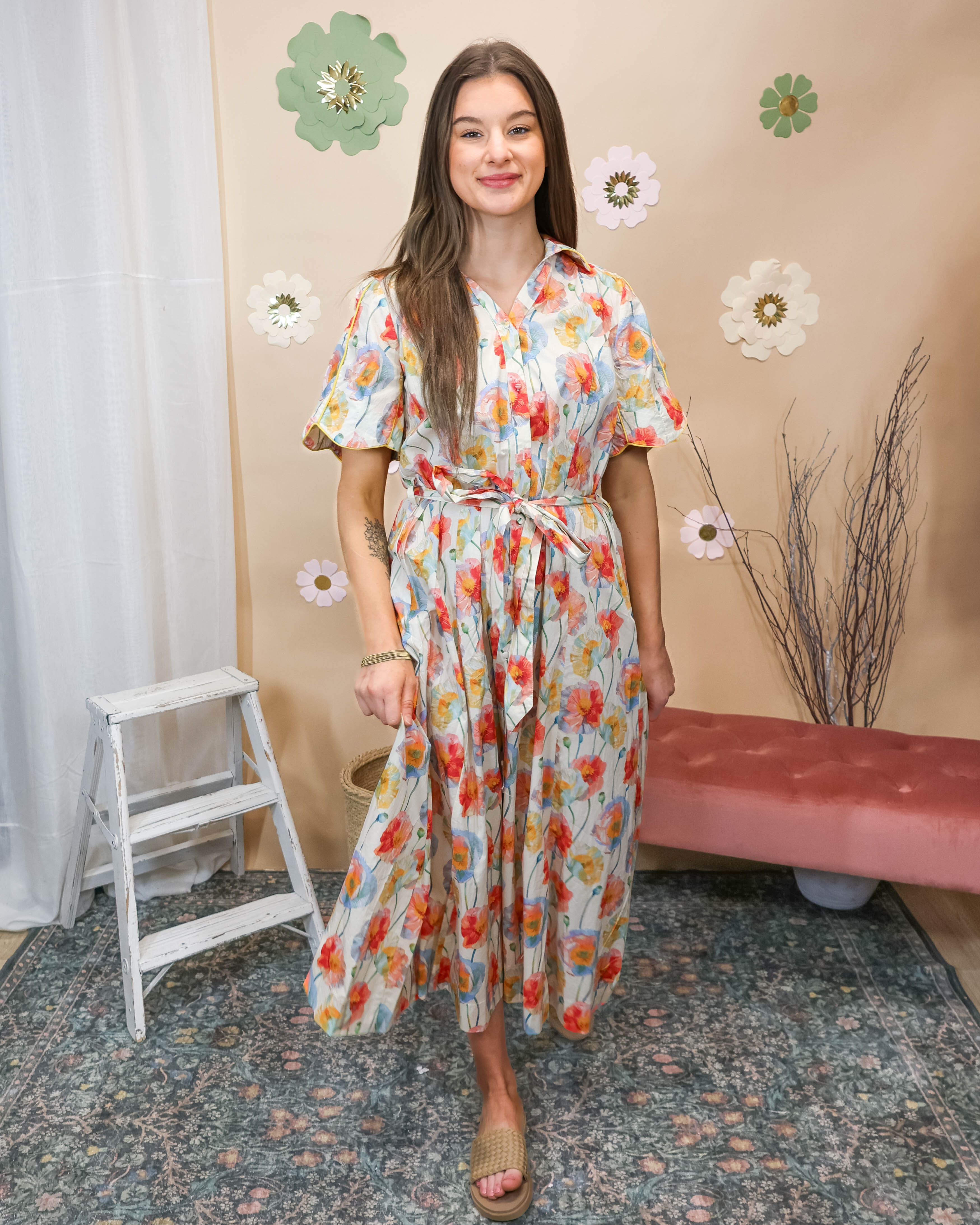 This bright floral dress features charming scalloped sleeves and a classic button-down style that's effortlessly chic. The tie-around waist lets you customize your silhouette for the perfect fit. Perfect for spring outings or dressed-up moments, it brings color and personality to every day.
