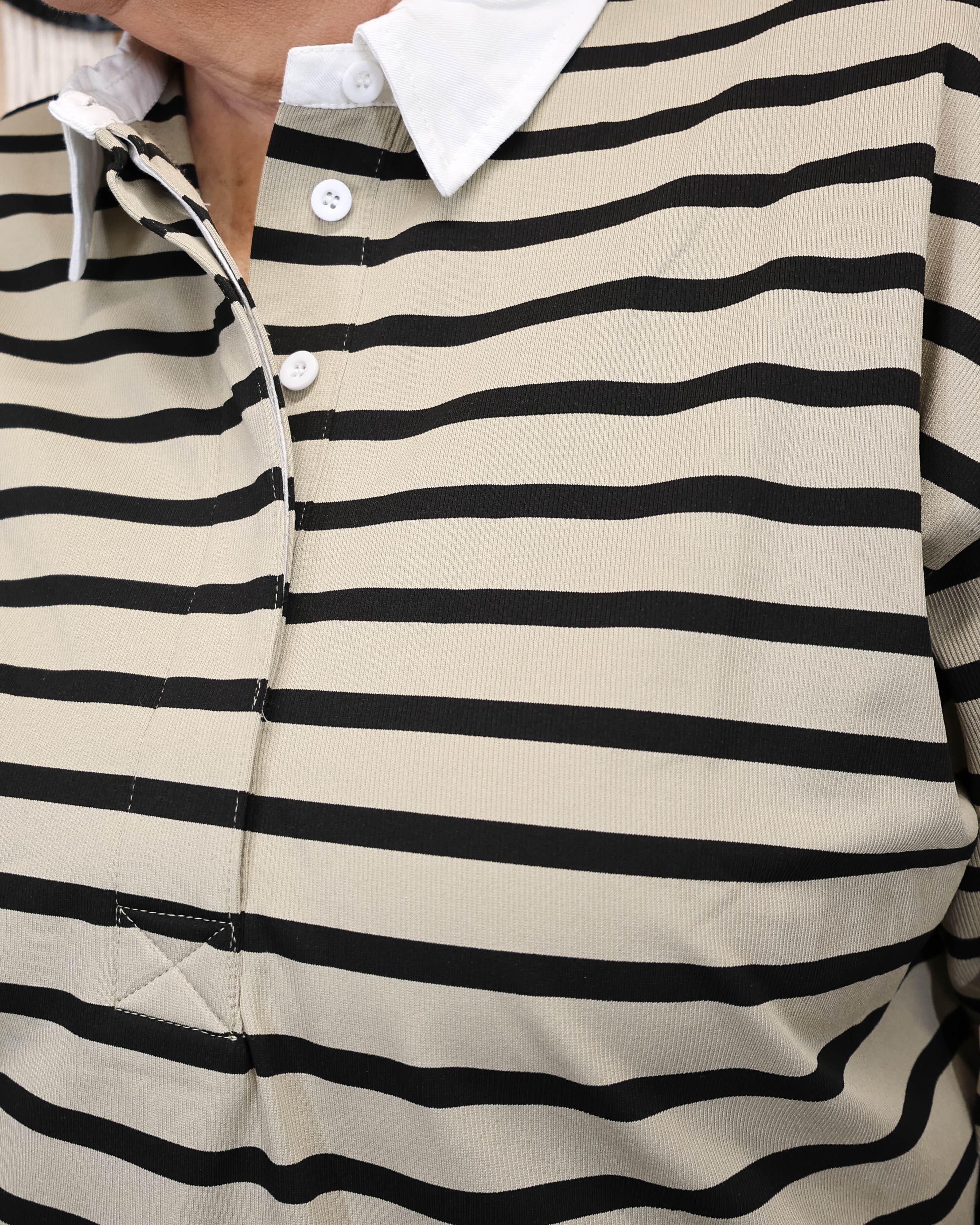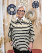 Elevate your everyday wardrobe with this versatile striped pullover that seamlessly transitions from office to weekend. The classic brown and black stripe pattern pairs perfectly with the refined collared neckline and button-front detail, creating a polished look that works harder than it appears. Long sleeves provide coverage and sophistication, while the relaxed pullover fit ensures all-day comfort without sacrificing style. Whether you're heading to a meeting or casual outing, this piece becomes an instant go-to that coordinates effortlessly with your existing basics.