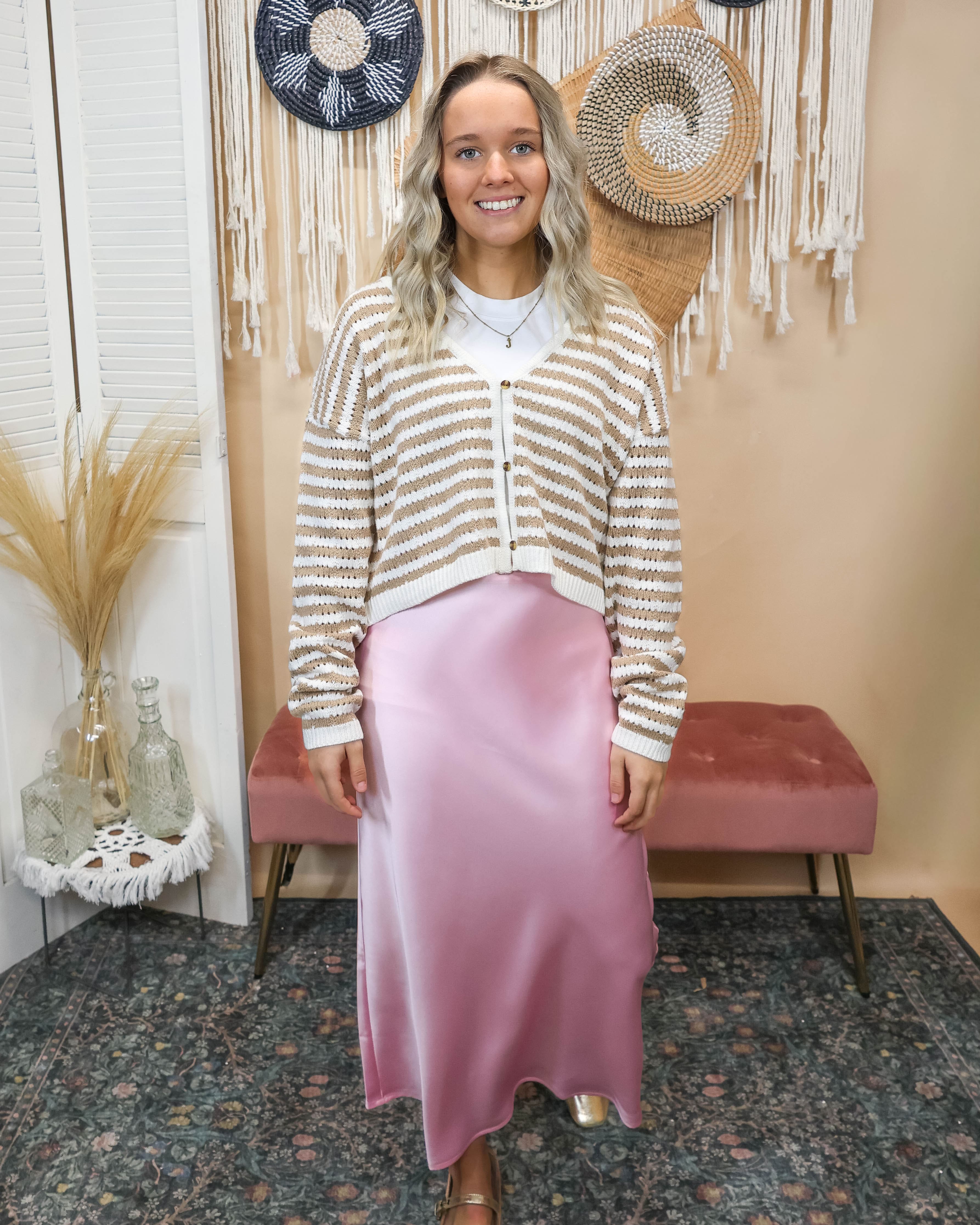Say hello to spring in this light pink satin midi skirt that's equal parts elegant and fun. The smooth fabric moves with you, the midi length keeps things classy, while the soft blush tone works with practically everything in your wardrobe. Layer it with a button-up, tuck in a cozy knit, or pair it with a fitted tee—this skirt is your ticket to looking polished without the fuss.