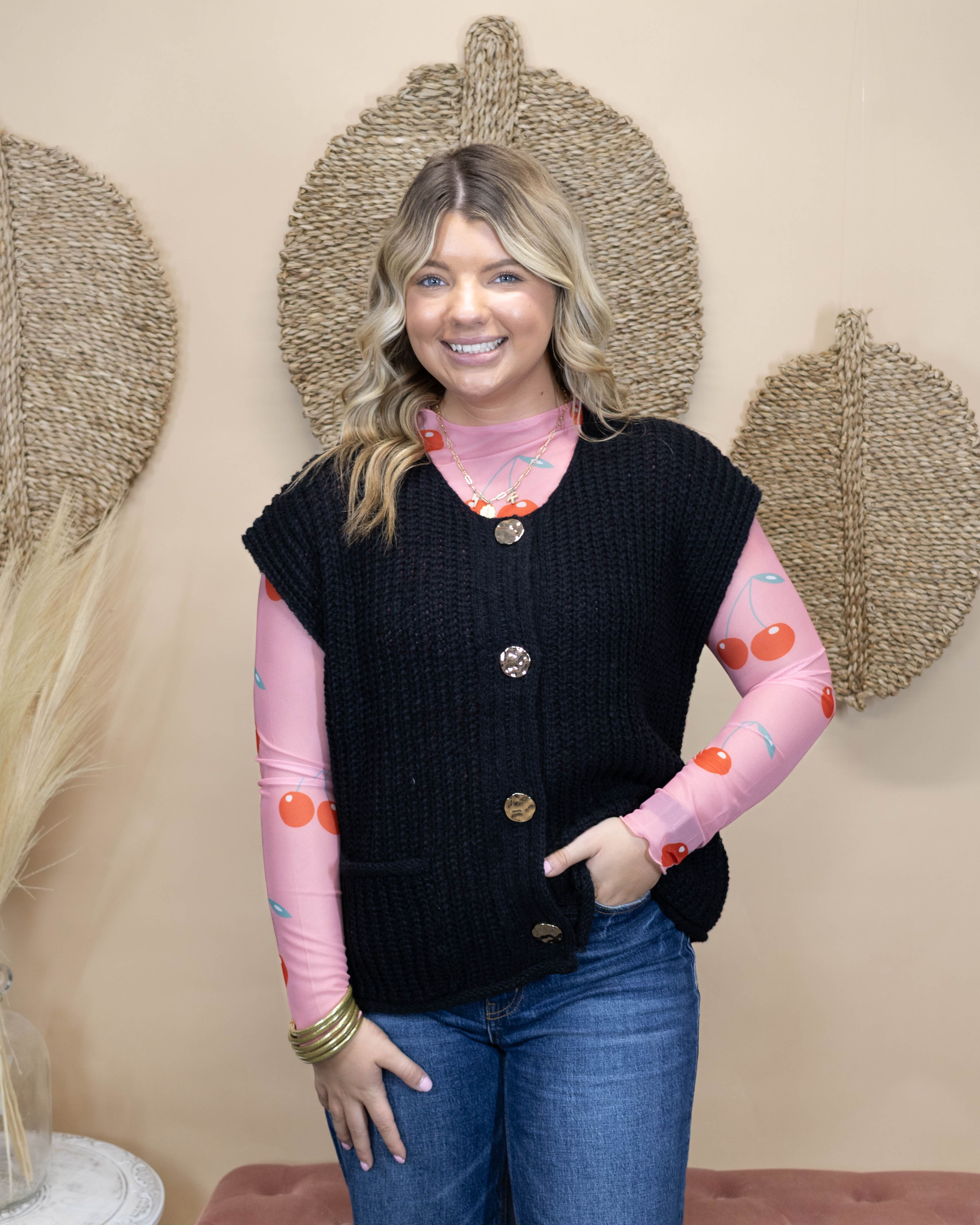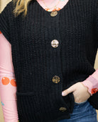 The Still Here Sweater Vest in black offers the perfect balance of warmth and breathability, ideal for layering. Its sleeveless design and V-neckline provide effortless style, while gold button accents add an elegant touch. Practical front pockets complete this versatile piece, making it as functional as it is chic. Elevate your wardrobe with this timeless vest that seamlessly blends comfort and sophistication.
