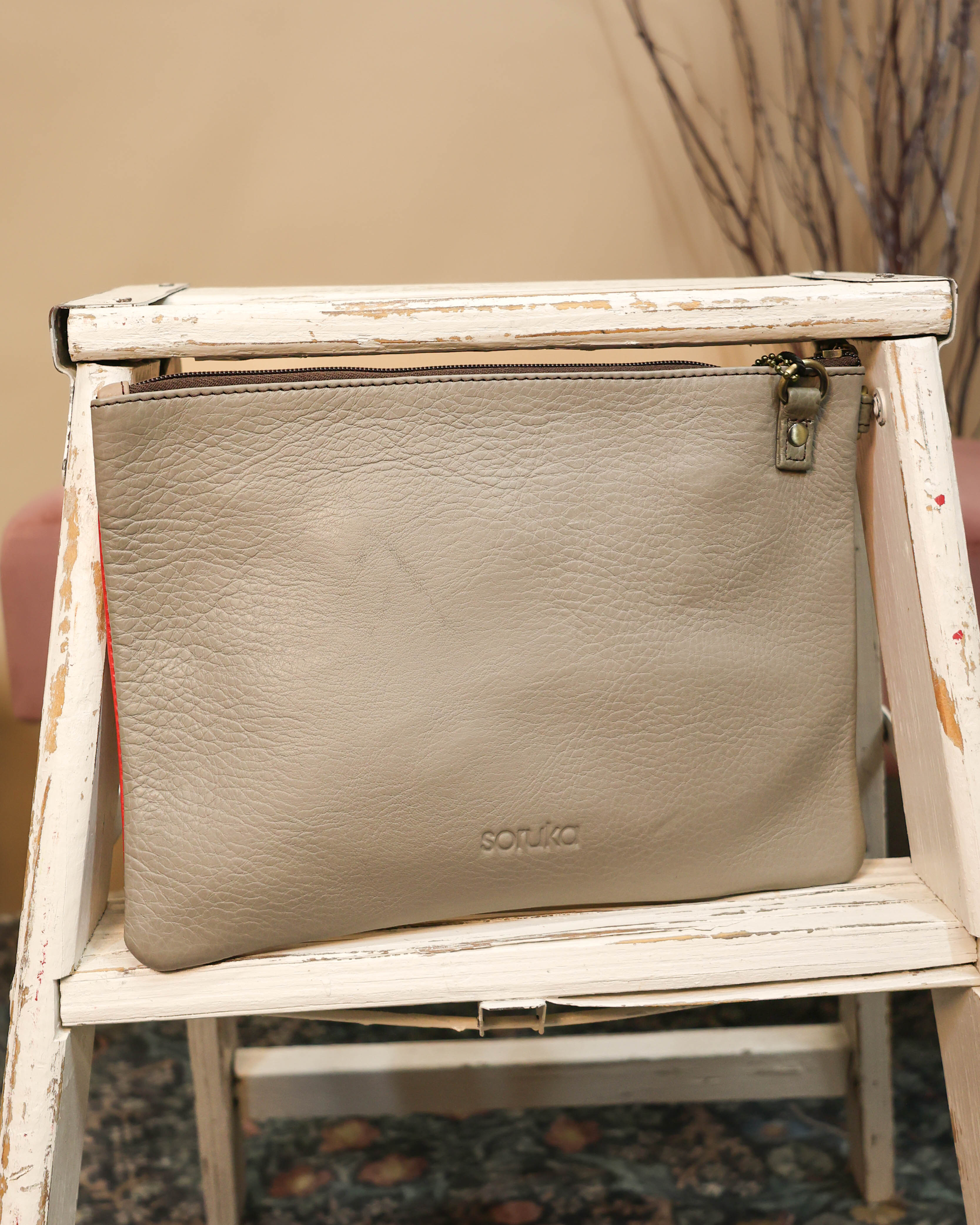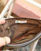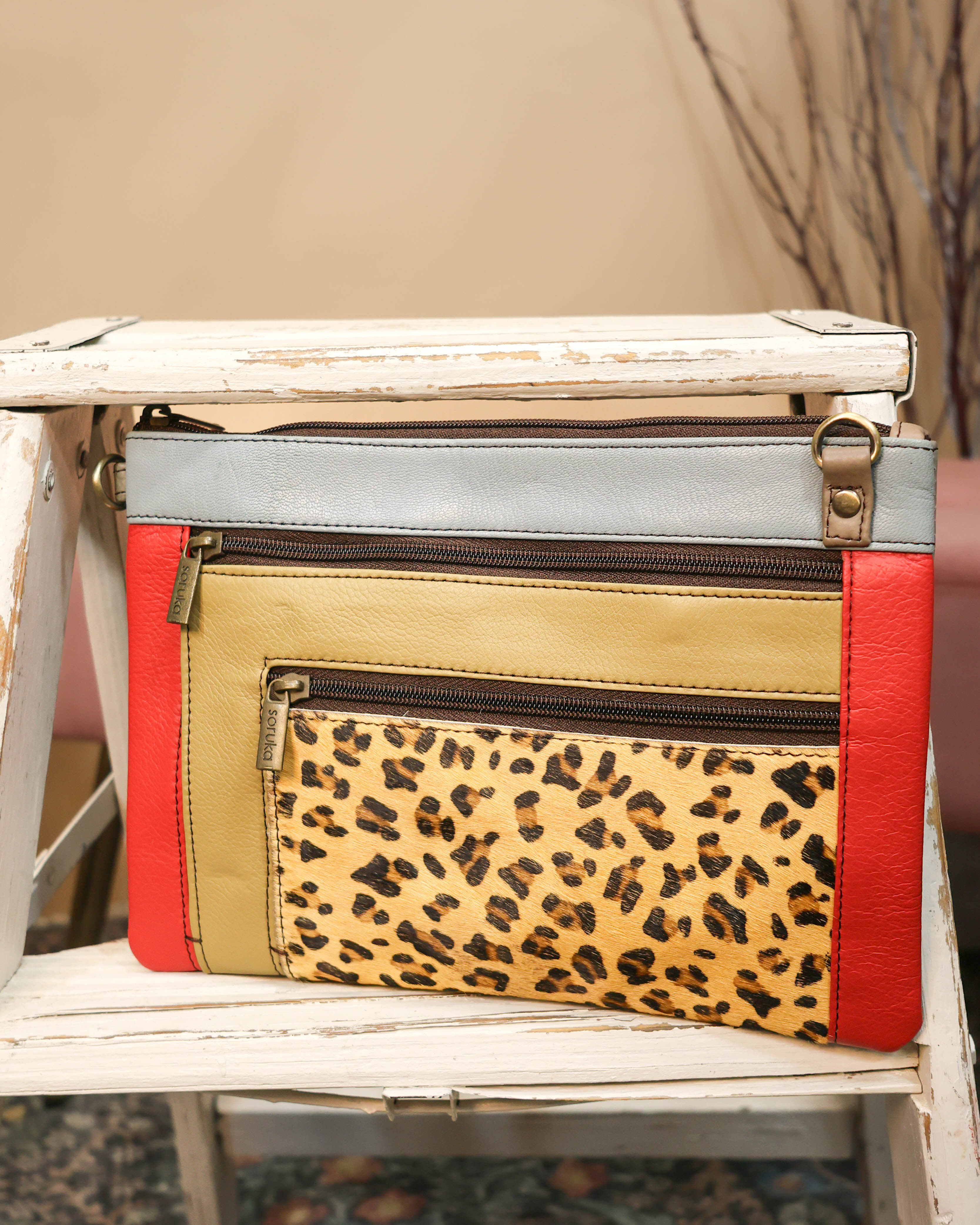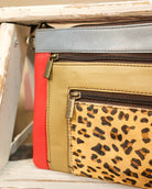 Carry your essentials in style with this one-of-a-kind crossbody bag featuring a bold animal print design. The spacious main compartment splits into three separate zipper-closure sections, keeping your belongings organized and easy to access. Wear it crossbody or add the wristlet strap for a closer to hand option. Crafted from genuine leather with unique character, this statement piece is as practical as it is eye-catching.