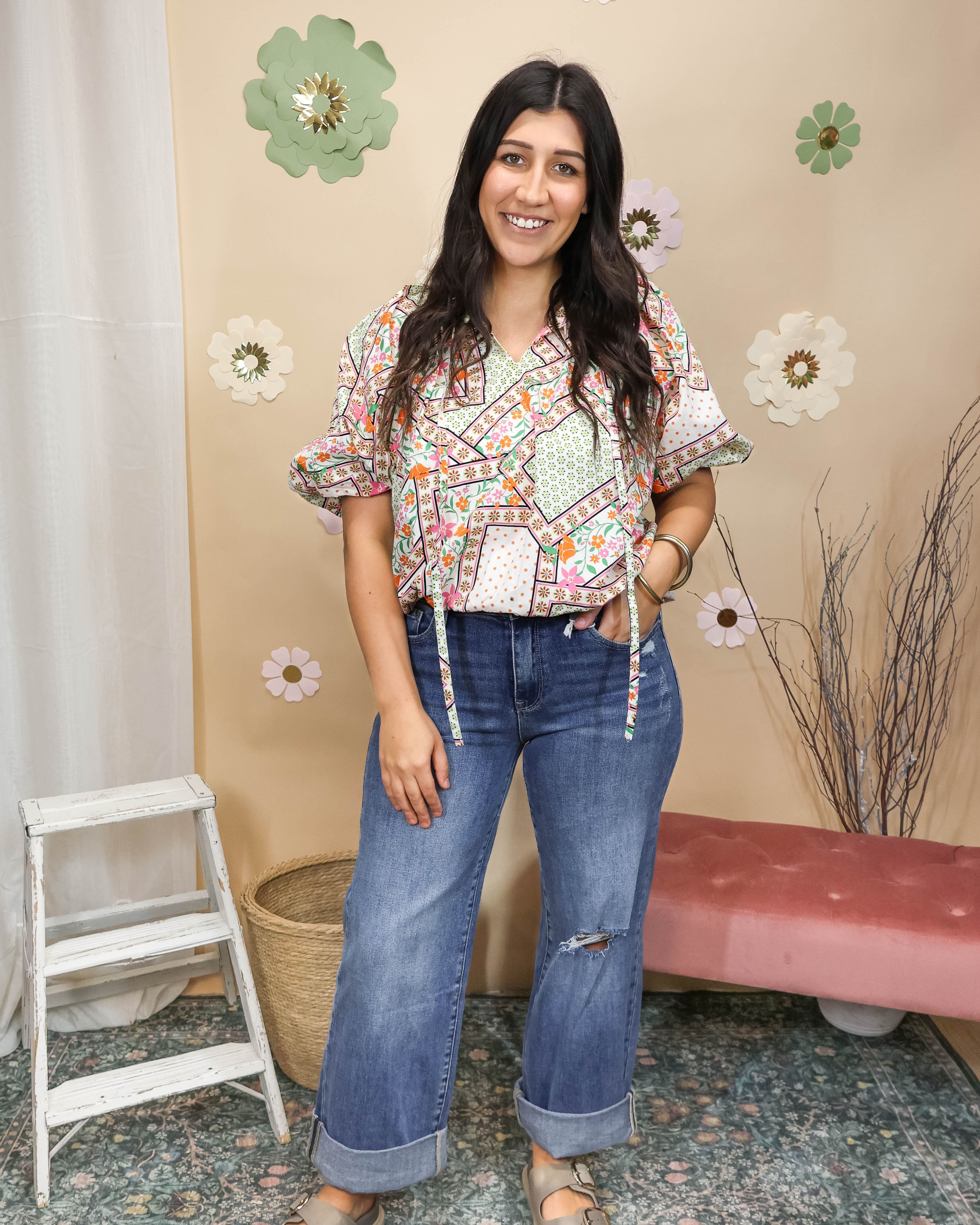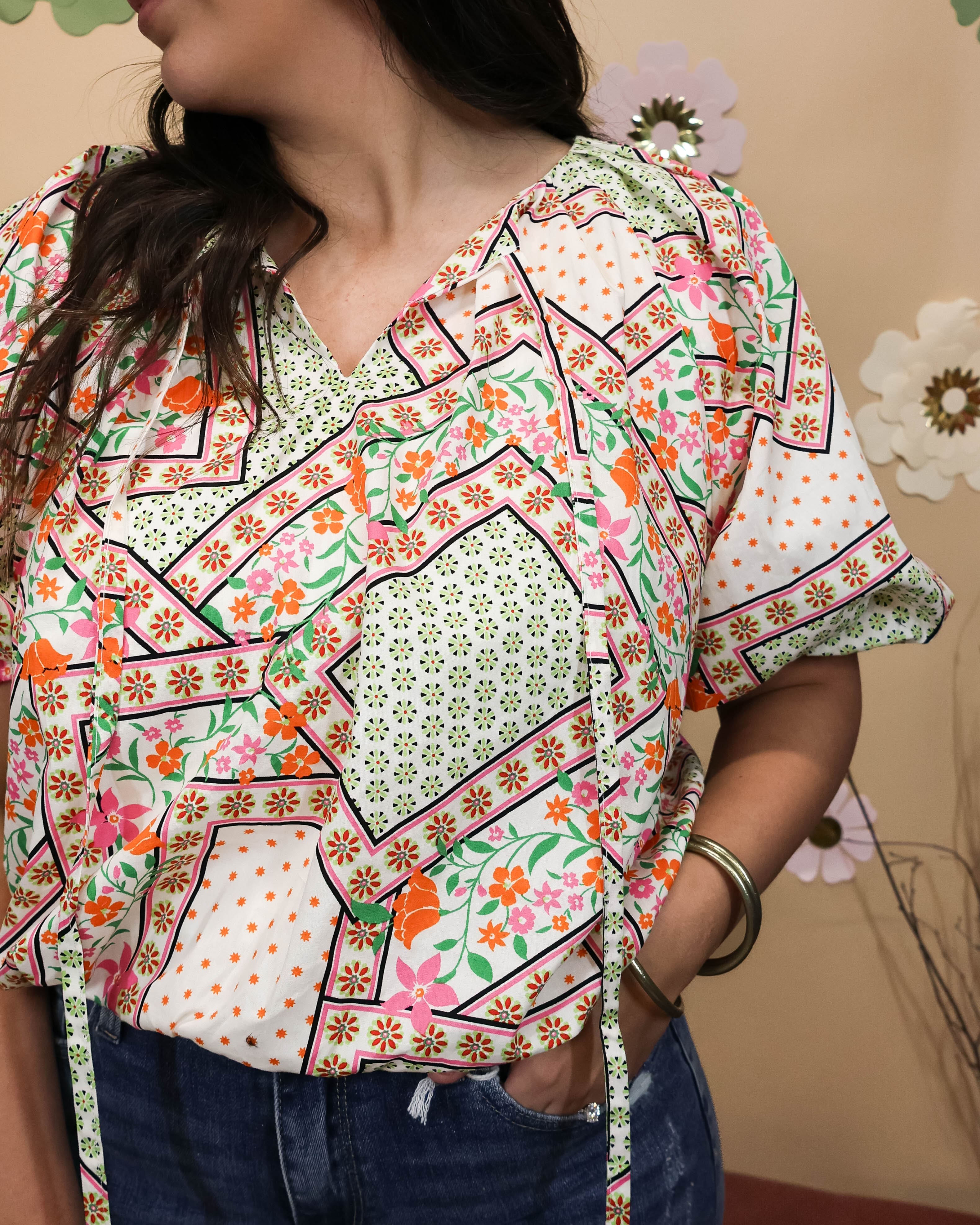 Get ready to turn heads in this vibrant Fun Times Floral Print Top. Bursting with bright florals and mixed prints that dance across the fabric, it's a celebration of color and pattern. Playful tie details add movement and personality, making this the kind of piece that instantly lifts your mood.