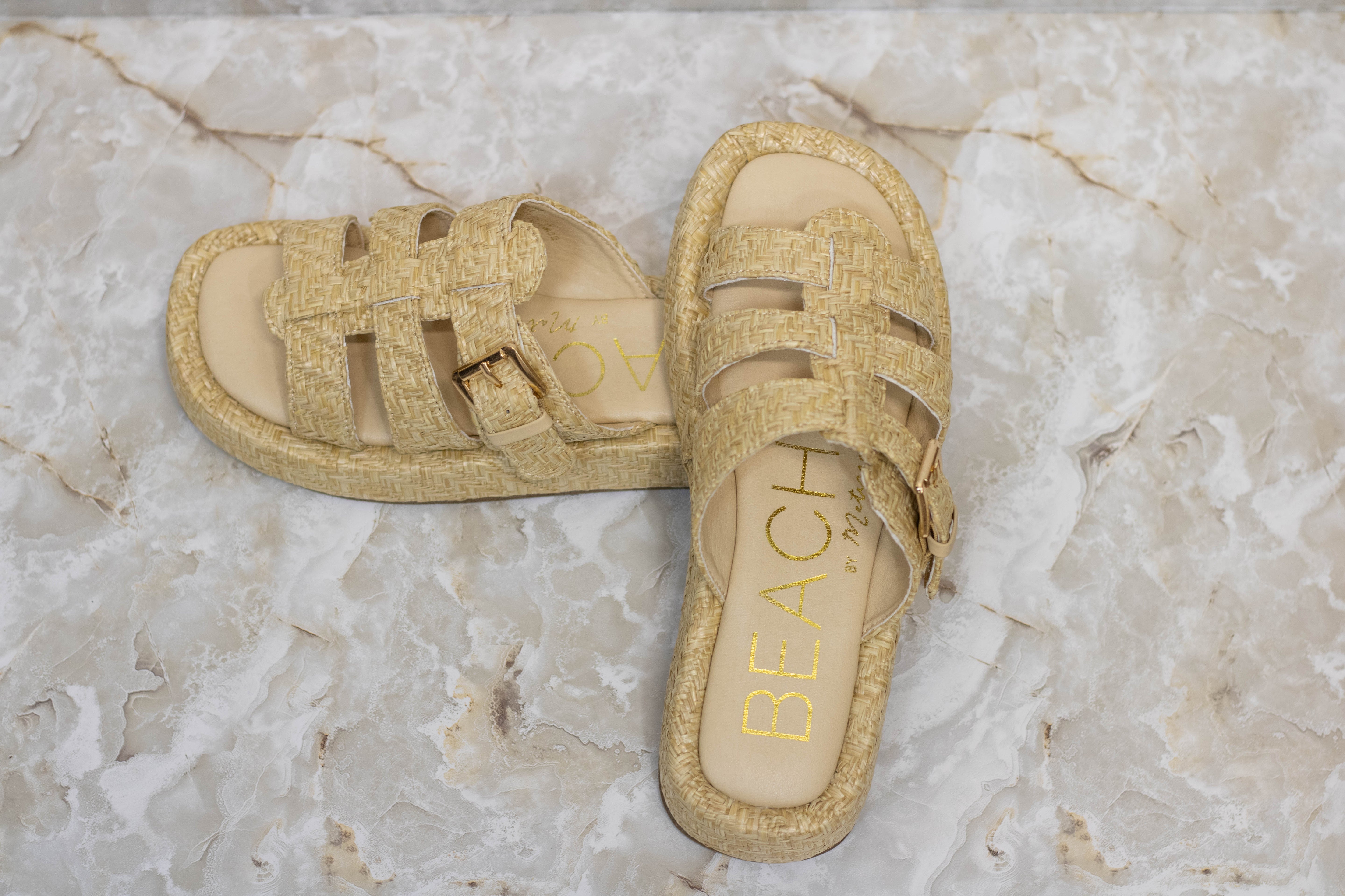 Elevate your summer style with our Cindy Sandal in natural. Crafted with a beautiful woven material and accented with a golden buckle, these sandals will bring a touch of glamour to any outfit. Perfect for strolling along the beach or dressing up for a night out. Put your best foot forward and step out in style!