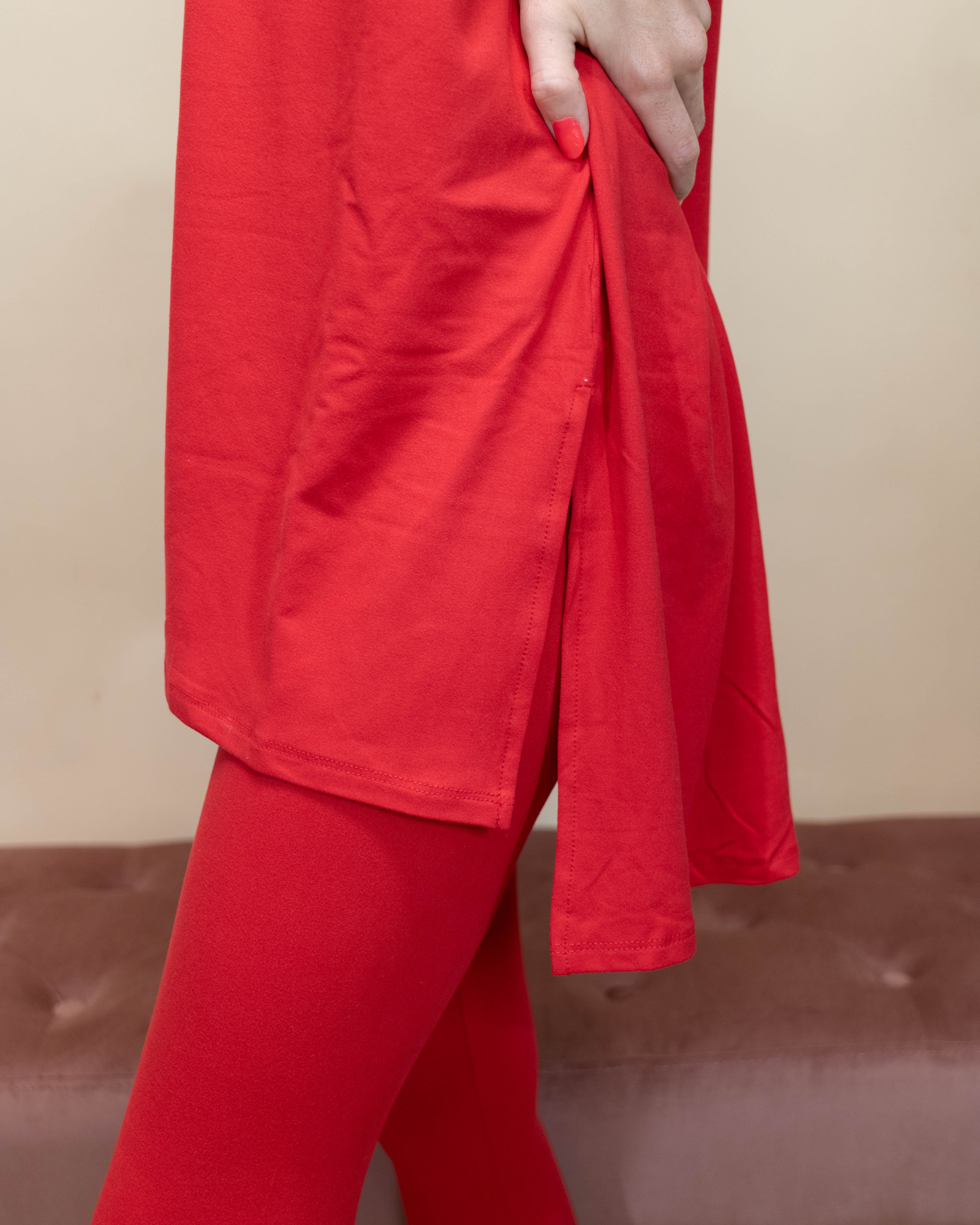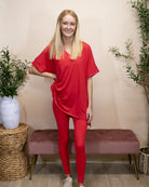 Experience ultimate comfort with the All Around Here Leggings Set in Ruby. Crafted from buttery soft fabric, this set features a flattering V neckline and leggings with an elastic waistband for a perfect fit. The top is designed slightly longer in the back with side slits, offering extra room and ease of movement. Ideal for everyday wear, this set combines style and comfort effortlessly.