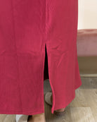 The Anything Can Happen Dress in rich burgundy features elegant gold faux buttons along the sides and a subtle side slit for a touch of allure. Its tank top design offers a sleek, flattering fit, making it a versatile choice for both casual and dressy occasions.