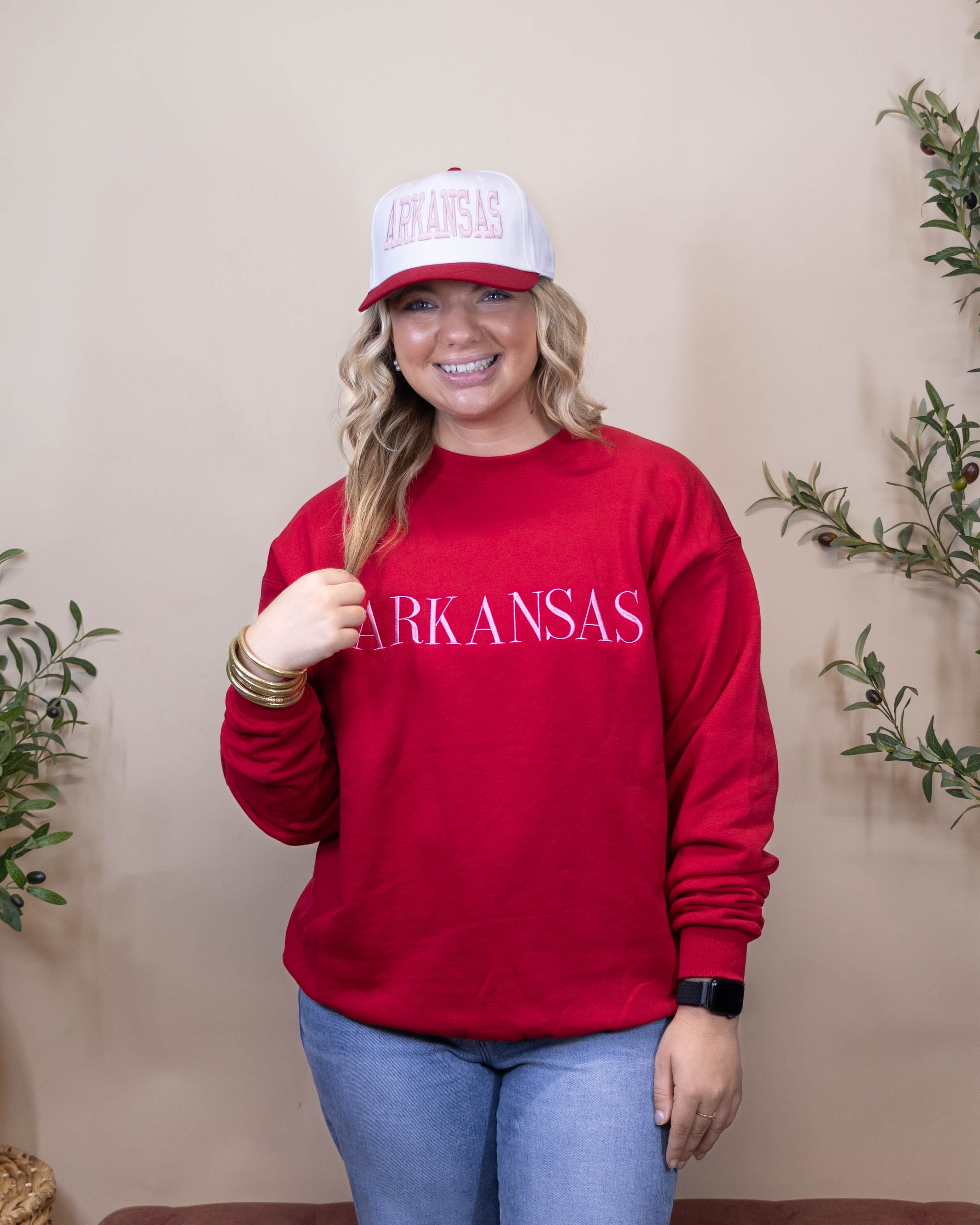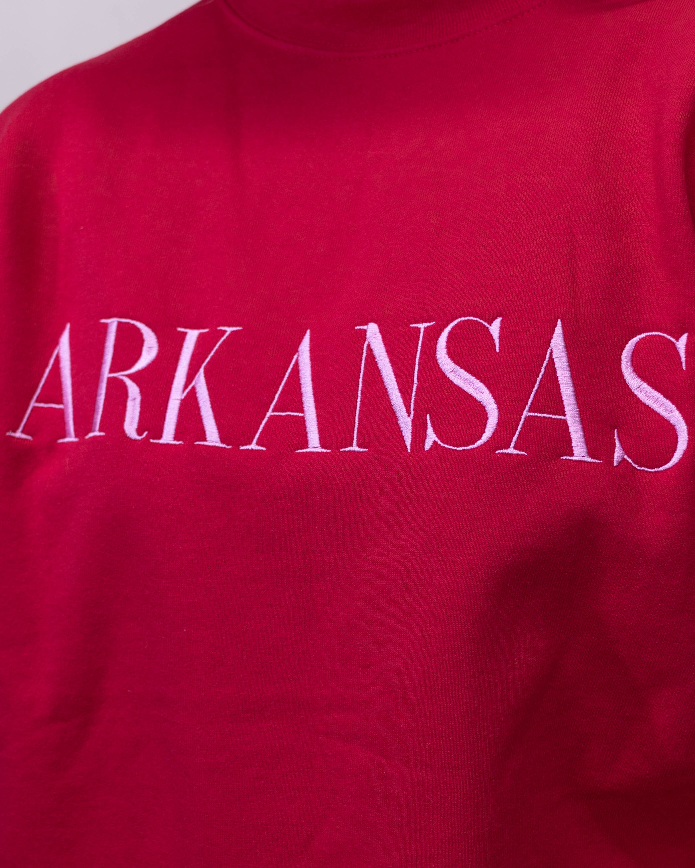 Show your Arkansas pride with this vibrant red sweatshirt featuring delicate pink embroidery that spells out ARKANSAS. Perfect for game day or casual wear, it combines spirited design with everyday comfort, making it an essential addition to your wardrobe.