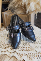 Elevate your wardrobe with the Bailey Mule, featuring sleek black mud material and adjustable grommet straps for a customized fit. Its pointed toe and small heel create a trendy, sophisticated silhouette, while the cushioned sole ensures lasting comfort throughout your day. Perfect for adding a stylish edge to any outfit.