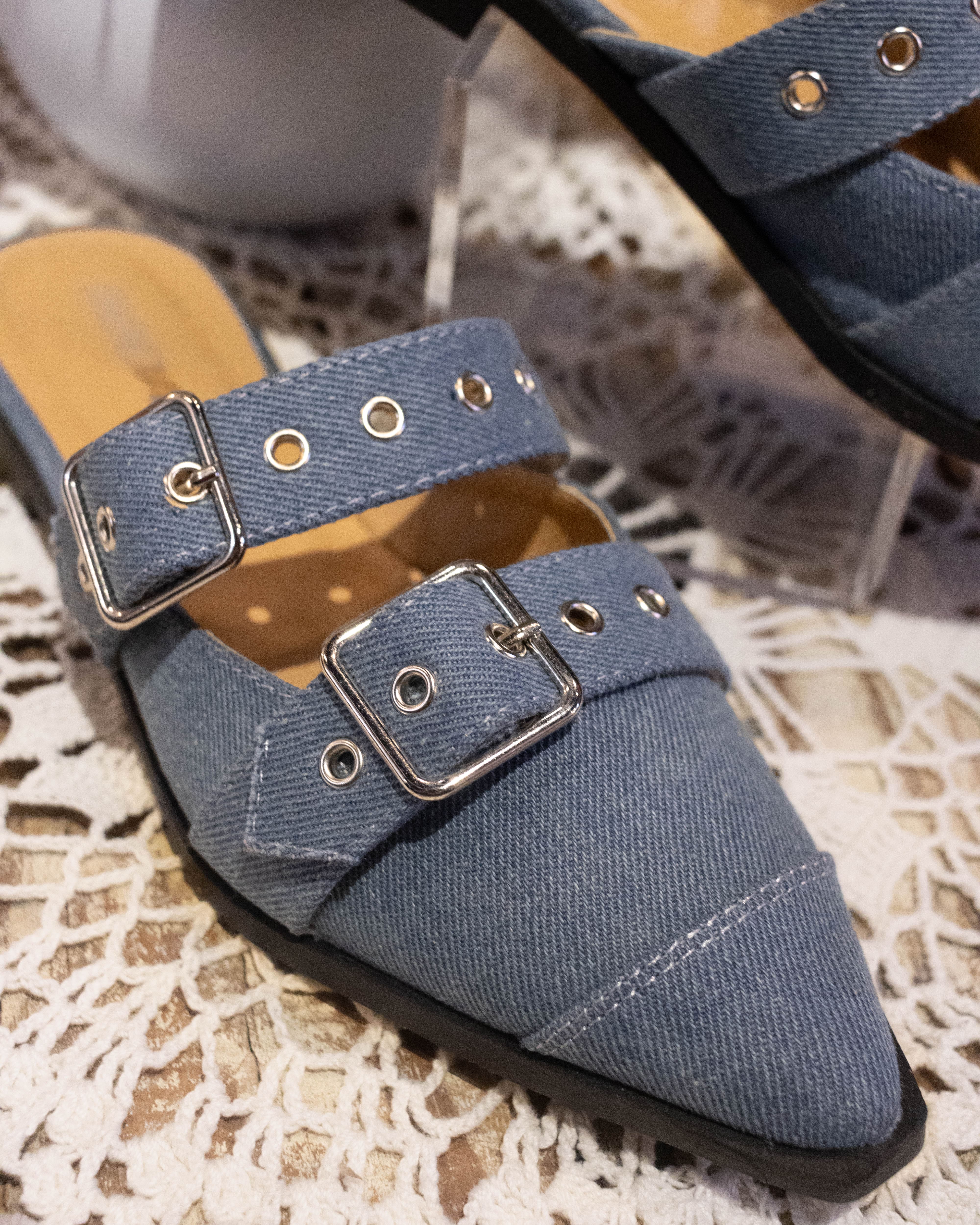 Step out in style with the Be Bold Denim Mule, featuring a chic pointed toe and adjustable straps for a secure, customized fit. Designed with a cushioned heel and a small heel height, these mules offer all-day comfort without sacrificing elegance. Perfect for adding a polished touch to any outfit.