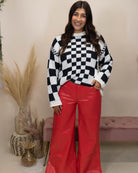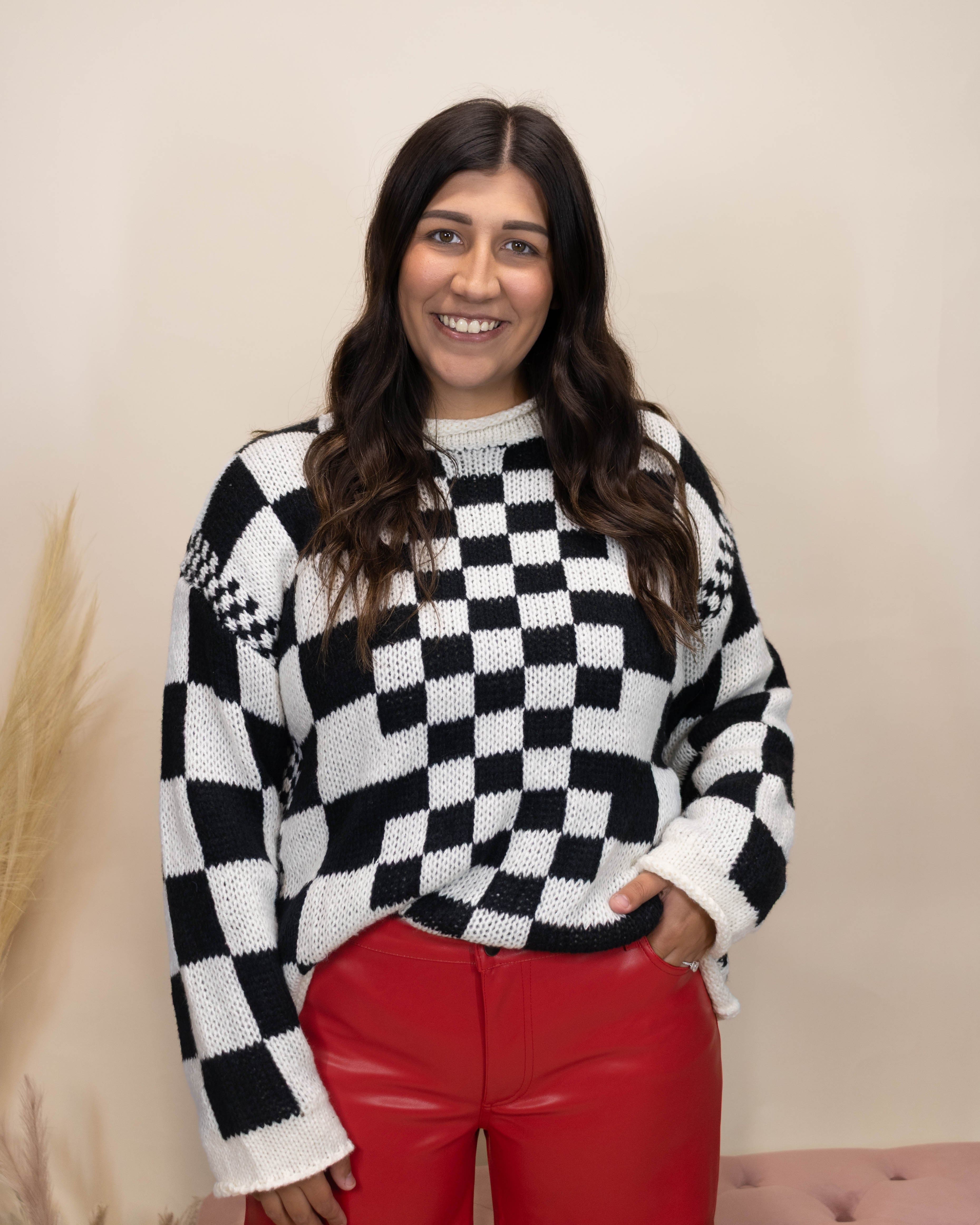 Stay effortlessly stylish with the Been Here Before Sweater, featuring a bold black and white checkered pattern. Its raw hemlines add an edgy, modern twist to a classic design, making it a standout piece for any wardrobe. Perfect for layering or wearing on its own, this trendy sweater brings both comfort and a fresh, fashion-forward vibe to your everyday look.