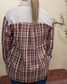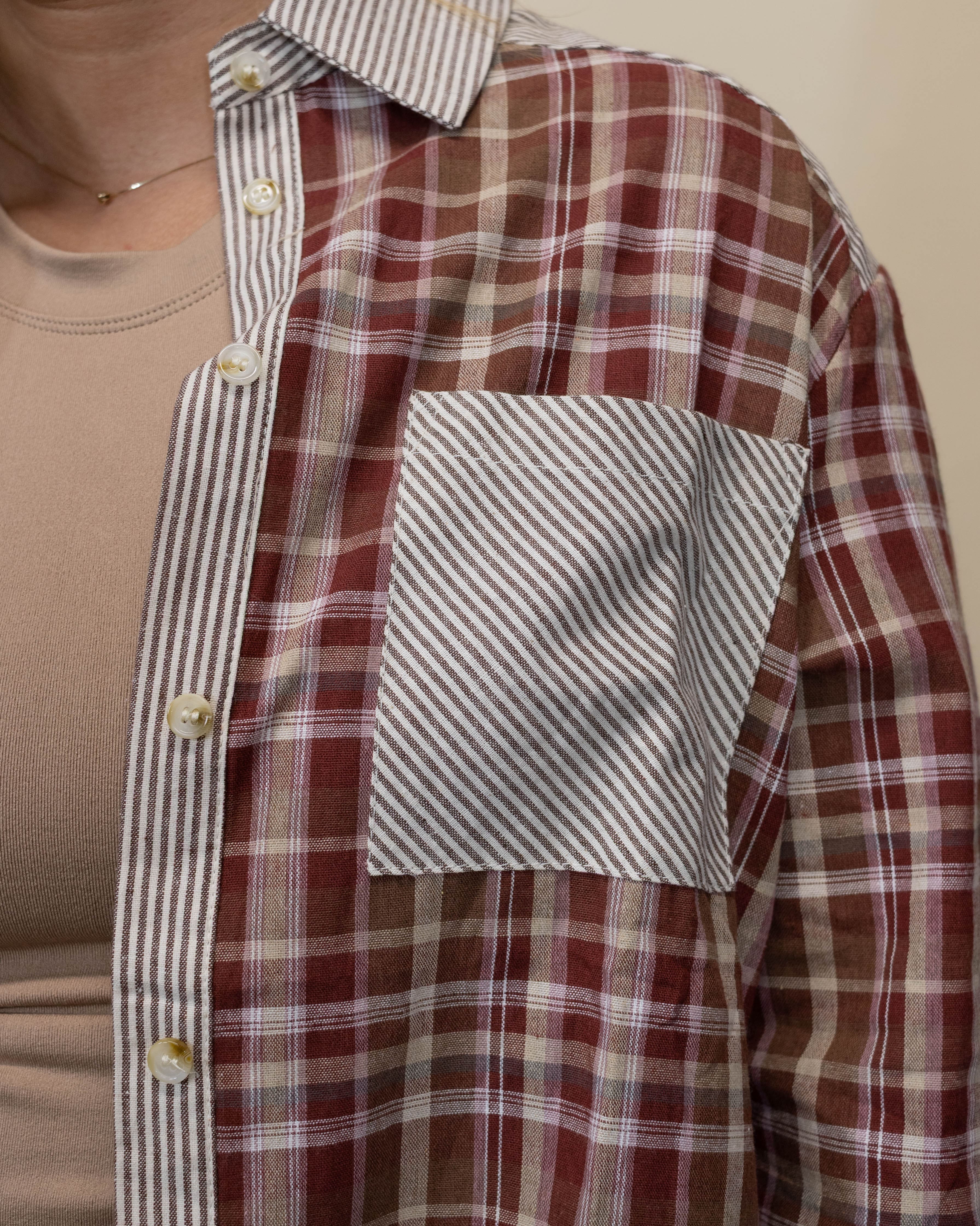 The Bring Things Together Top features a lightweight red and tan plaid design with two distinct patterns for a unique twist. This button-up shirt includes a classic collar and a convenient pocket, combining comfort and style for a versatile wardrobe staple.