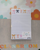 Add a touch of elegance to your notes with the Coquette Bows 4x6 Notepad! Featuring dainty hand-drawn bows in soft, feminine hues, this notepad is perfect for jotting down to-do lists, reminders, and sweet messages. Its compact size makes it easy to keep on your desk, in your purse, or by your bedside. Whether you’re a planner lover, stationery collector, or just adore a touch of coquette charm, this notepad is a must-have! Features: 52 sheets, lined, chipboard backer Size: 4×6"
