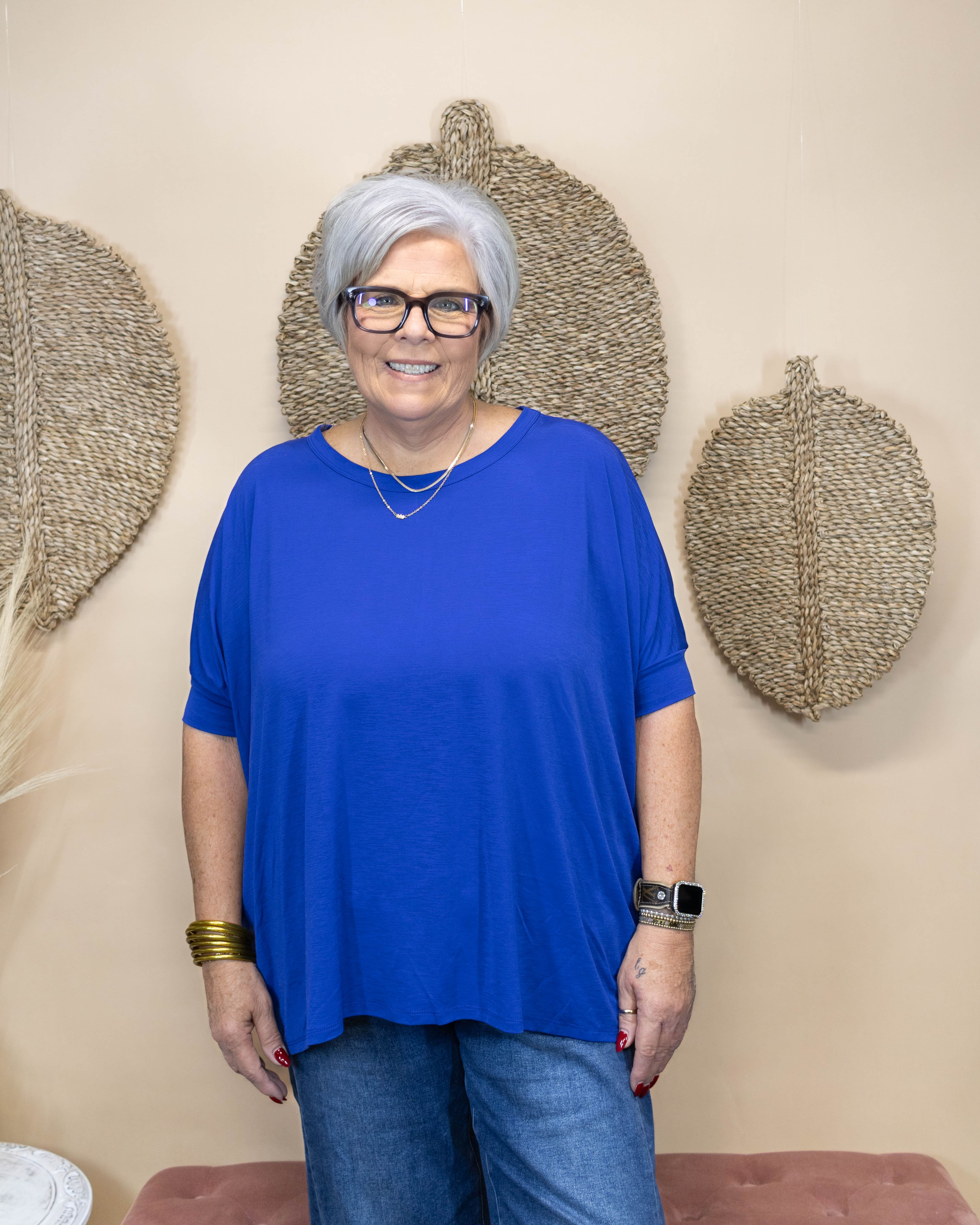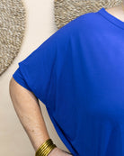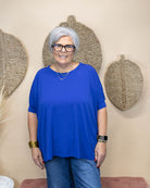 Show your school spirit in style with the Even More Top - Royal. This oversized top features dolman sleeves and a slick, stretchy fabric that moves with you, making it perfect for travel or everyday wear. Its vibrant royal blue color stands out, ensuring you look and feel confident wherever you go. Comfortable and versatile, this top is a must-have addition to your wardrobe.