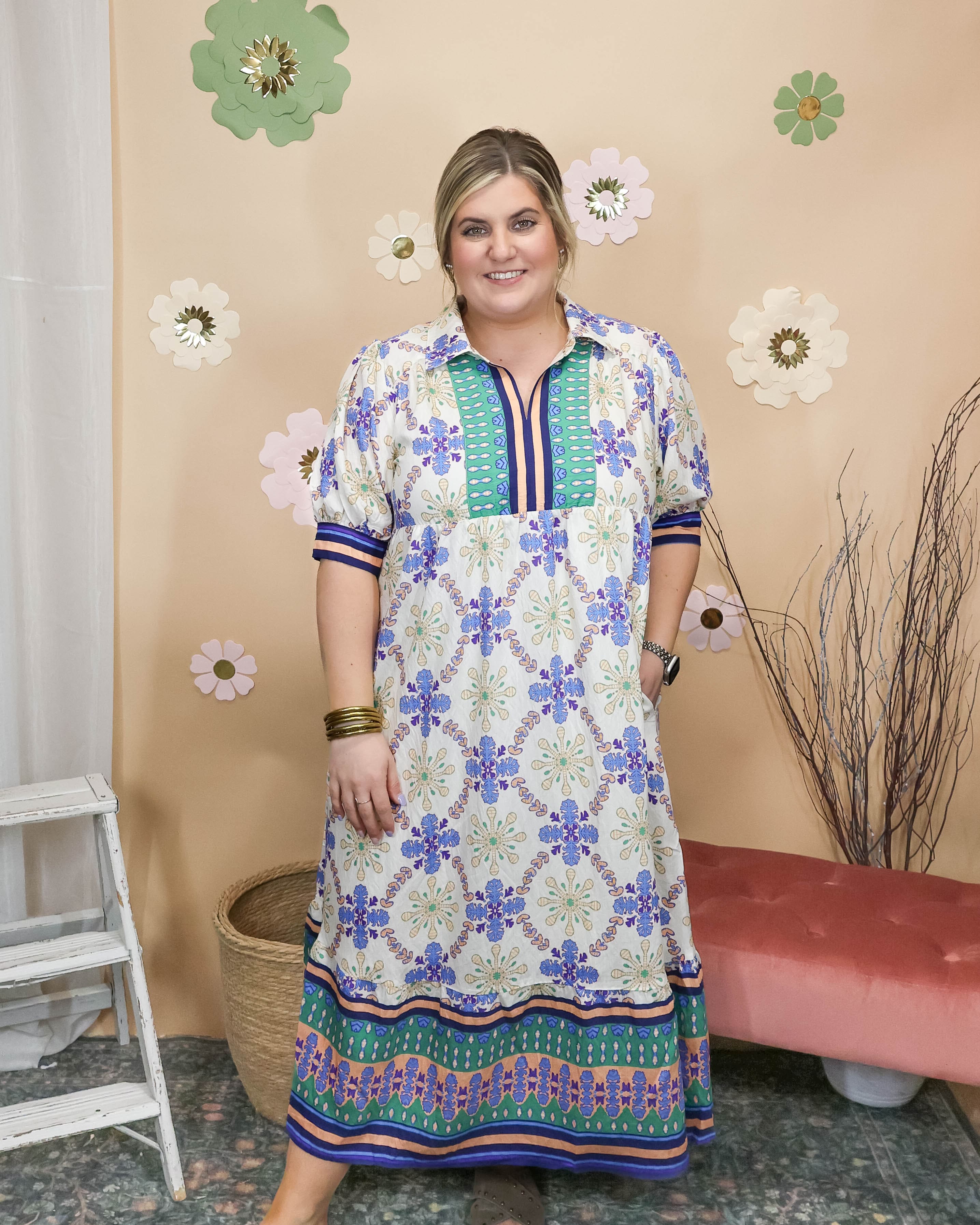 Effortless style meets everyday comfort in this versatile midi dress. Featuring a classic collar and a cheerful multi-pattern design, it's perfect for spring days and beyond. Hidden pockets keep your essentials close while you move through your day. The relaxed fit and midi length offer flattering coverage that works for casual outings, weekend brunches, or laid-back office settings. A wardrobe staple that transitions seamlessly from season to season.