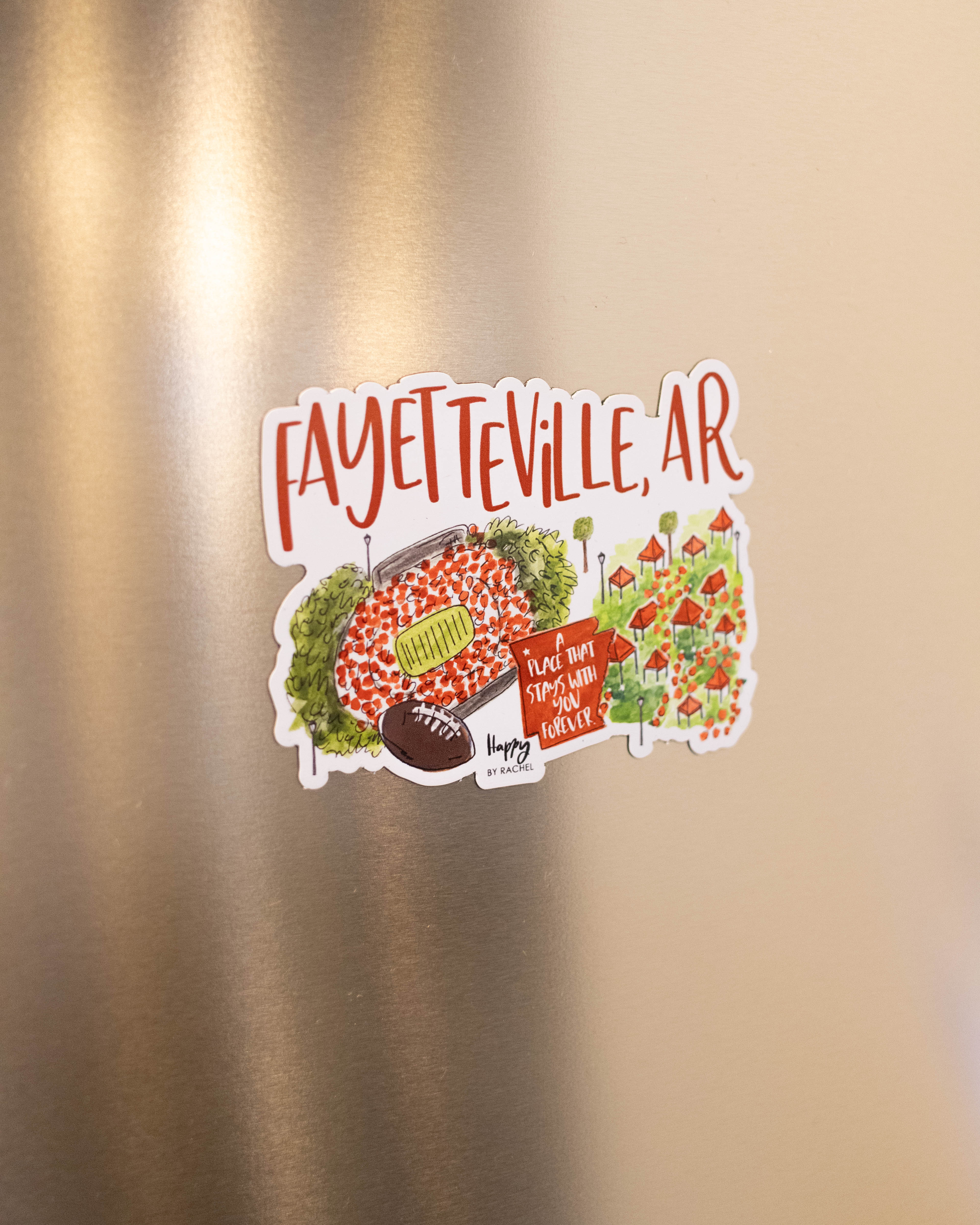 Perfect for representing your favorite AR football town on a Saturday! Our Fayetteville, AR magnet is made of a thick, durable vinyl that protects from scratches, water & sunlight. Measures approximately 3"x4".
