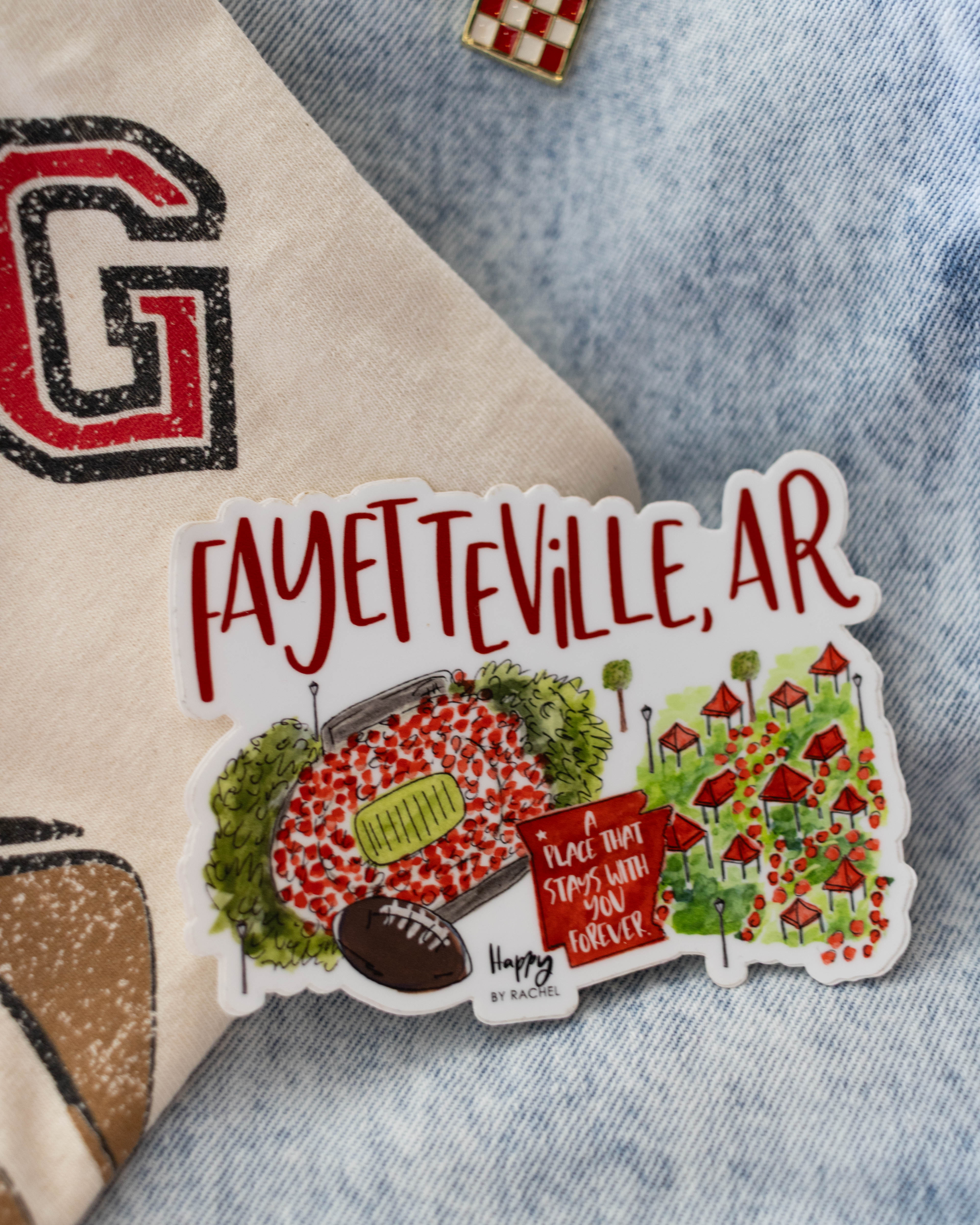Perfect for representing your favorite football town! The Fayetteville, AR sticker is made of a thick, durable vinyl that protects from scratches, water & sunlight. Perfect for sticking on your favorite tumbler, laptop, or car! Measures approximately 3"x4".