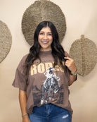 Experience comfort and style with the First Rodeo Graphic Tee. Its soft brown fabric and casual fit make it perfect for everyday wear, while the rodeo-inspired graphic adds a bold, authentic touch. Designed to keep you comfortable and confident, this shirt pairs effortlessly with your favorite jeans for a laid-back, Western-inspired look.