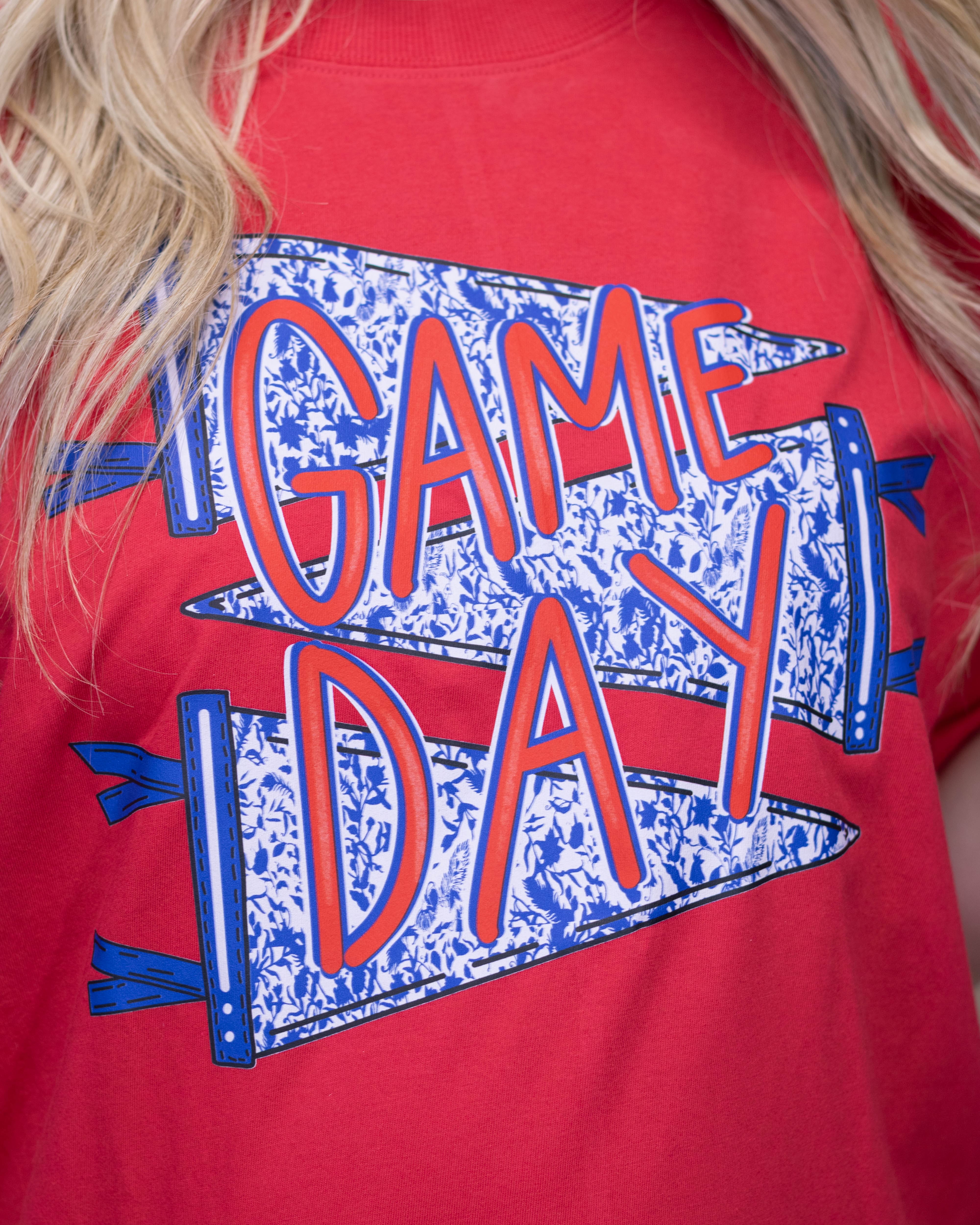 Show your team spirit with the Flags Game Day Graphic Tee. This vibrant red top features eye-catching blue floral flags and bold red game day lettering, combining sporty energy with a fresh, stylish twist. Perfect for cheering on your favorite team in comfort and style.