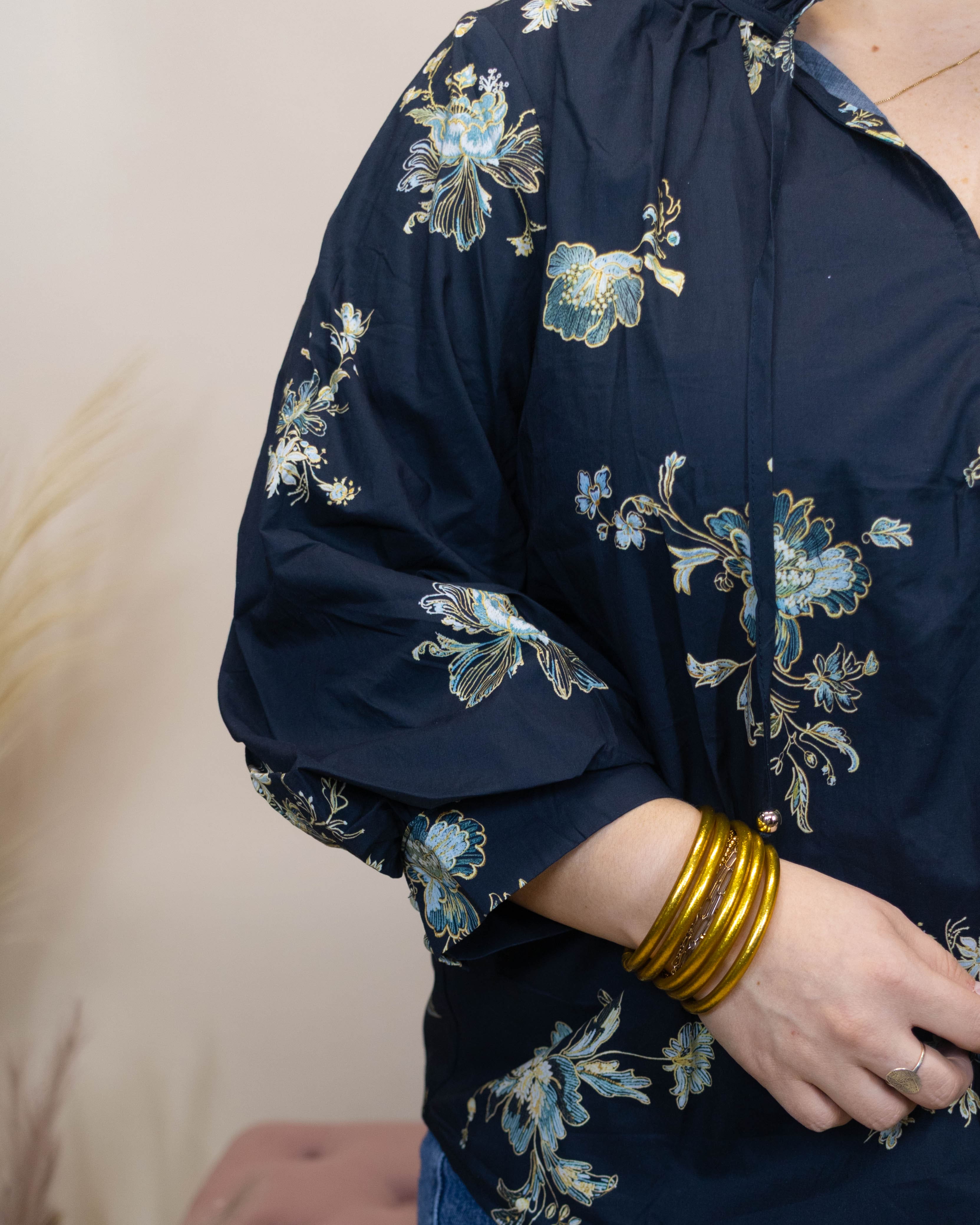 Elevate your wardrobe with the Got Me Thinking Top, featuring a deep navy background accented by creams and various blue shades. This lightweight top offers a flattering V-neckline with charming tassels and a delicate scalloped collar. The cuffed midi balloon sleeves and quarter button-up front add stylish detail while ensuring comfort and ease. Perfect for any occasion, this top combines elegance and effortless wearability.
