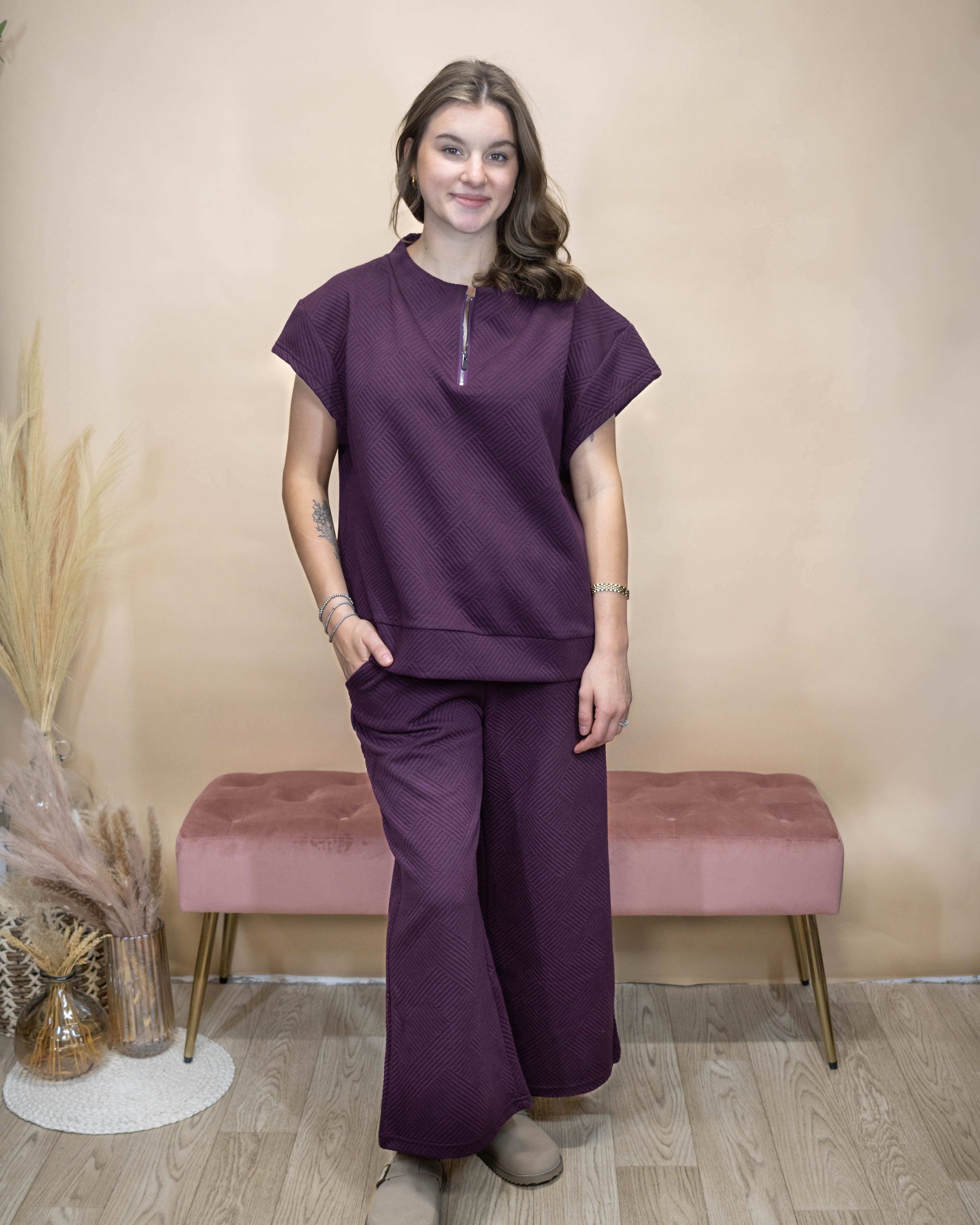 Experience effortless style with the Haley Textured Set in rich burgundy. This ribbed short-sleeve top offers a comfortable, casual fit perfect for everyday wear, yet its subtle texture and flattering cut make it easy to dress up for any occasion. Pair it with your favorite accessories or layers to create a versatile look that transitions seamlessly from relaxed days to polished evenings.