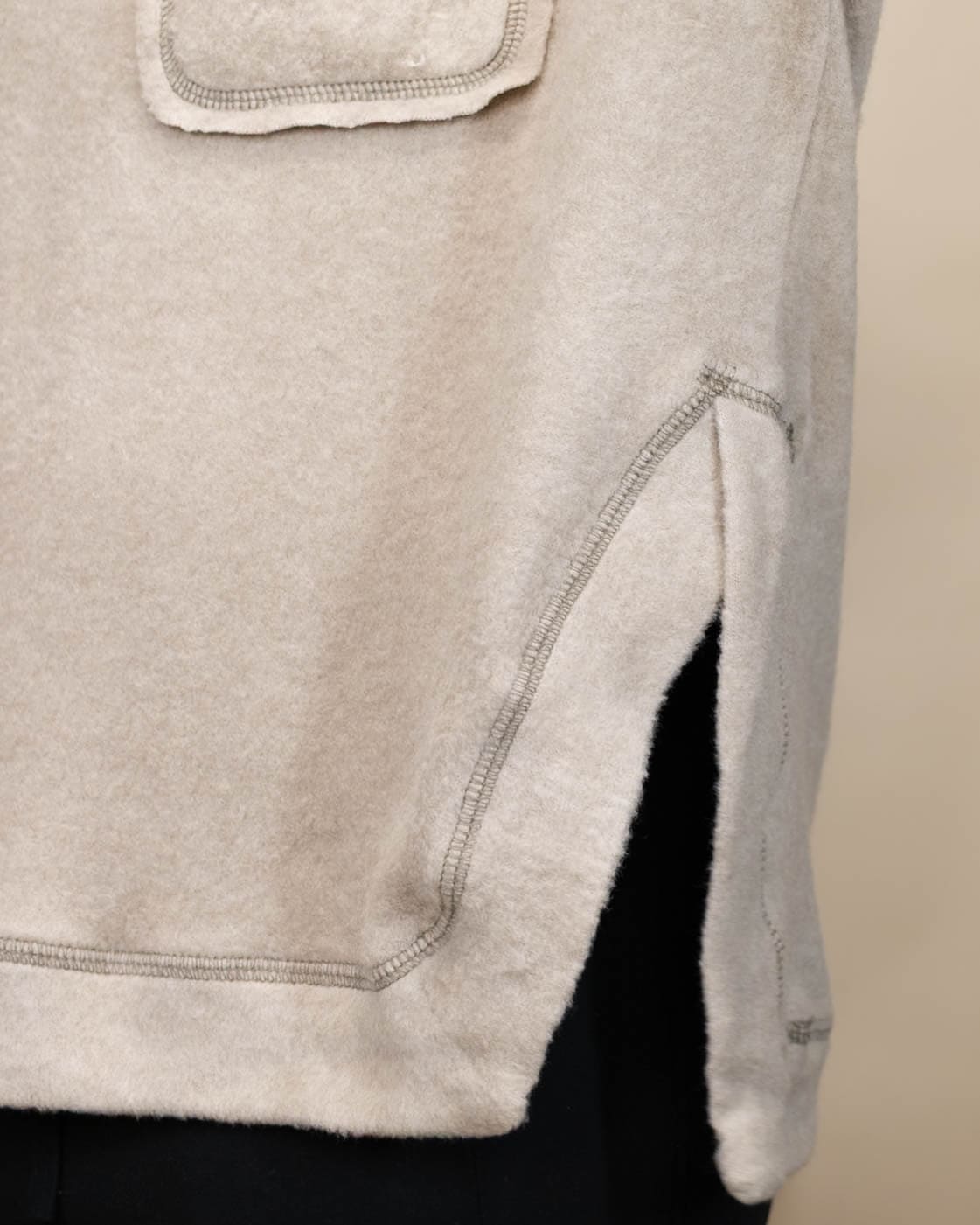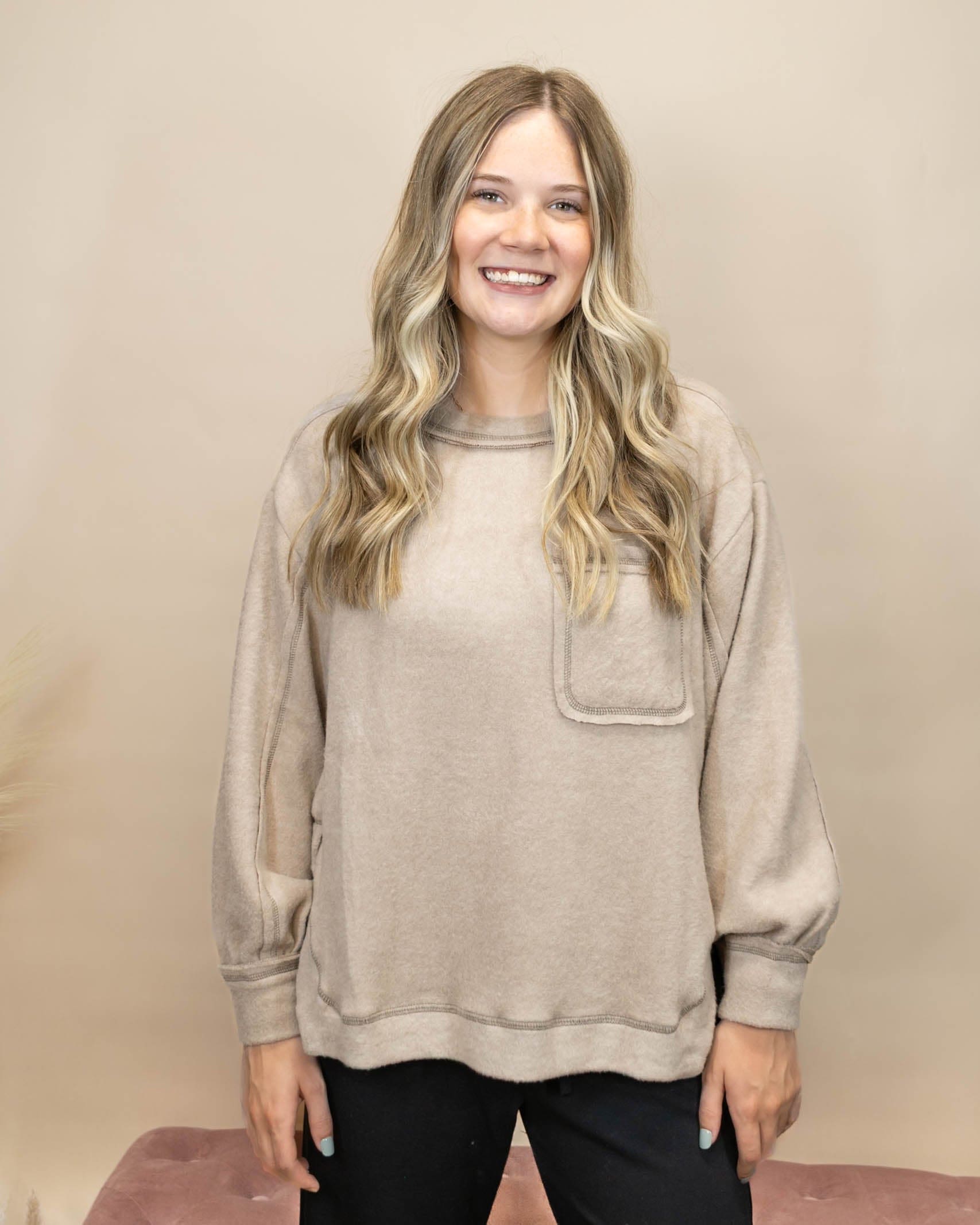 Experience cozy comfort with the It's Easy Top in Mocha. This soft, lightweight long-sleeve features a convenient pocket, providing warmth without bulk. Perfect for layering or wearing on its own, it effortlessly combines style and comfort for your everyday wardrobe.