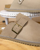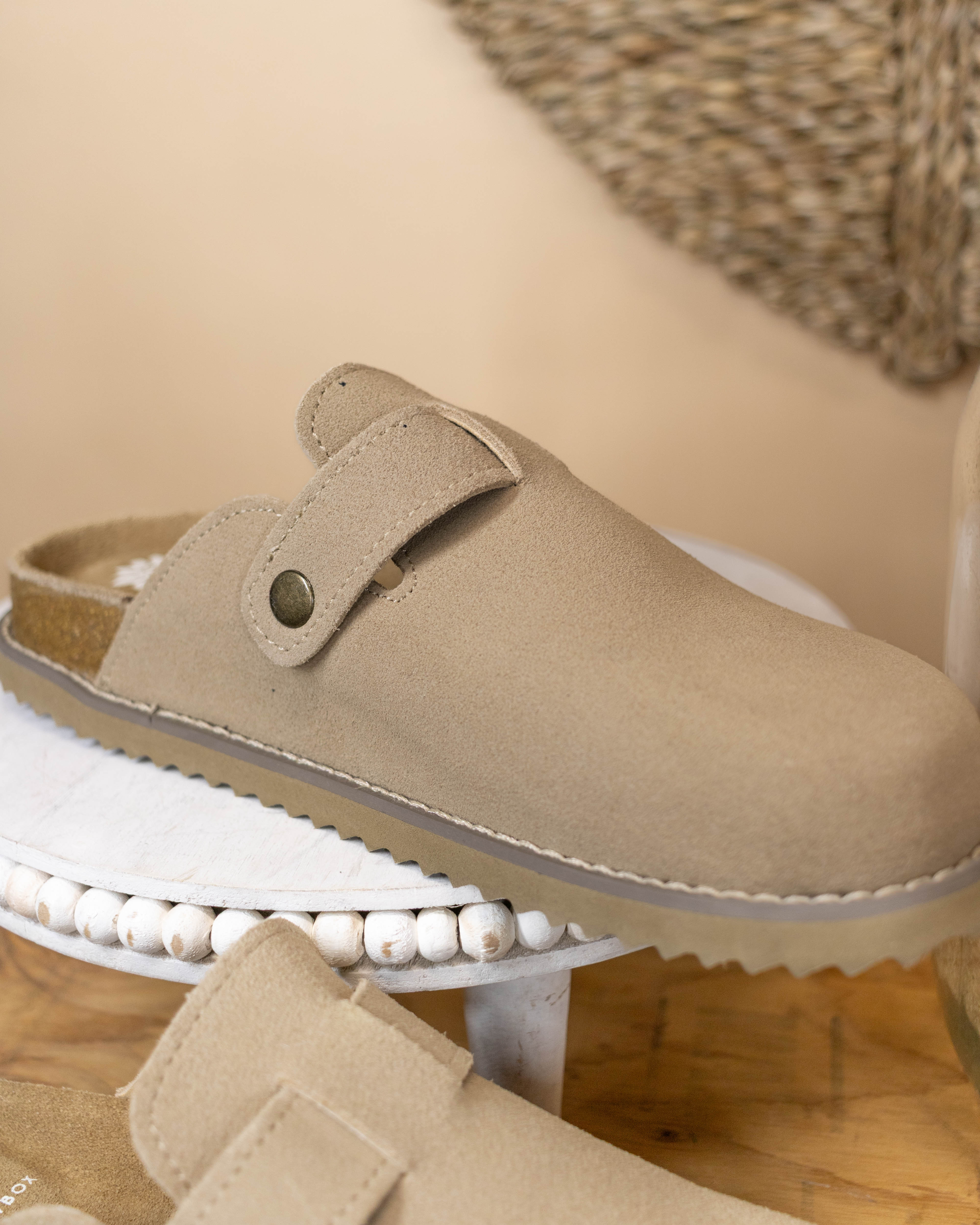 The Maible Clog in Taupe combines comfort and durability with its lightweight suede design and adjustable strap for a perfect fit. Featuring a cushioned heel and sturdy sole, these clogs provide support and all-day wearability while maintaining a stylish, versatile look.