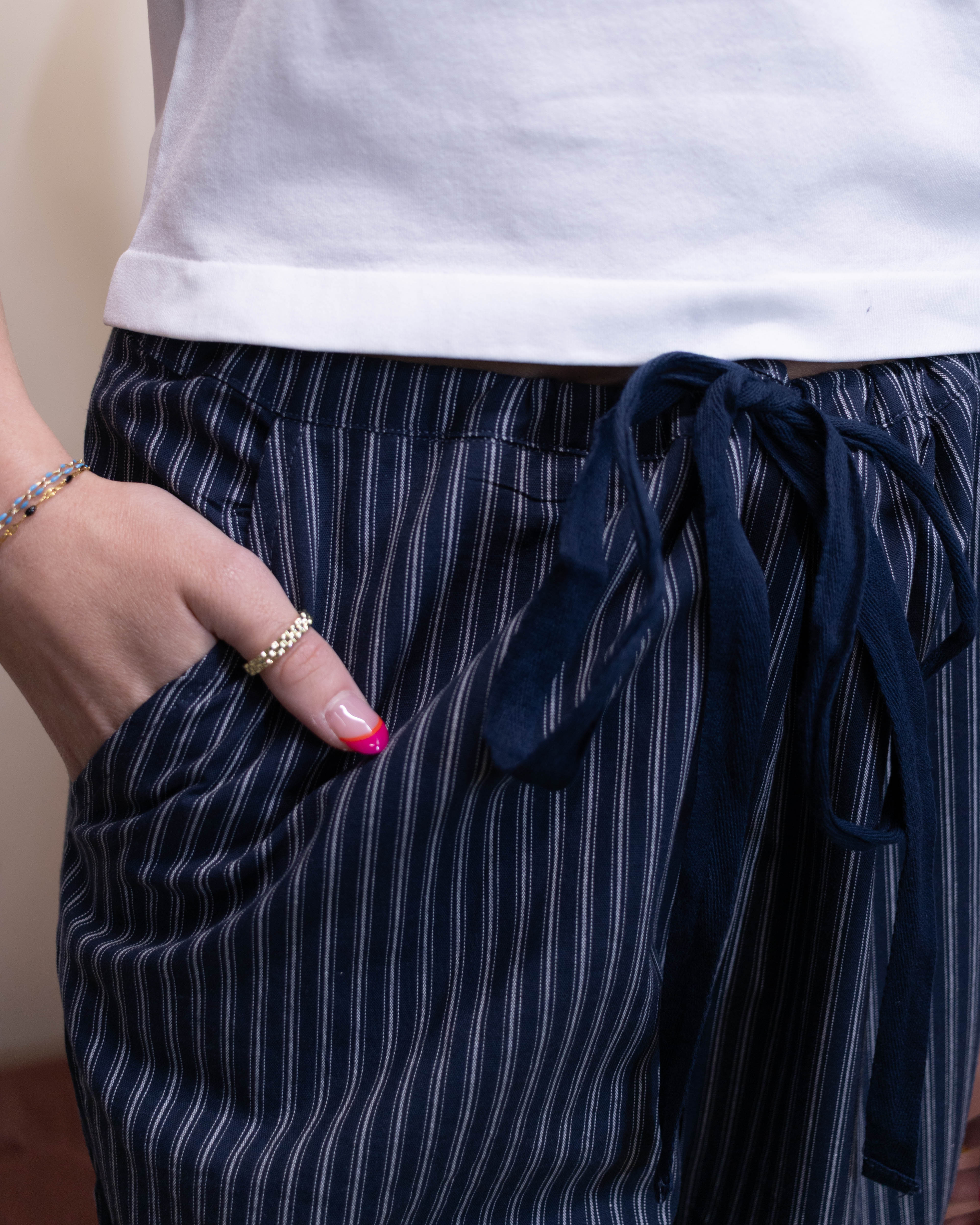 Add a splash of fun to your wardrobe with the Make It Your Own Pant! These navy and white striped pants feature a straight leg and a playful cropped length. The drawstring waistline ensures a perfect fit, while convenient pockets keep your essentials close. Perfect for mixing and matching with your favorite tops for a look that’s all you!