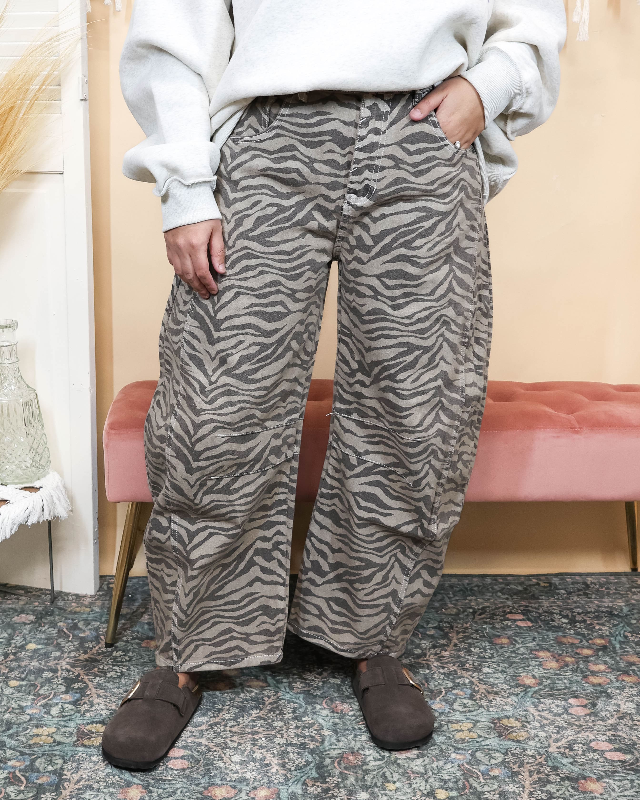 The Say It All Barrel Pant features a unique barrel jean cut and a fun zebra stripe pattern in neutral tones. This design combines casual comfort with an eye-catching aesthetic, making it suitable for various occasions. The distinct style allows for versatile pairing with different tops, enhancing your wardrobe options.