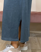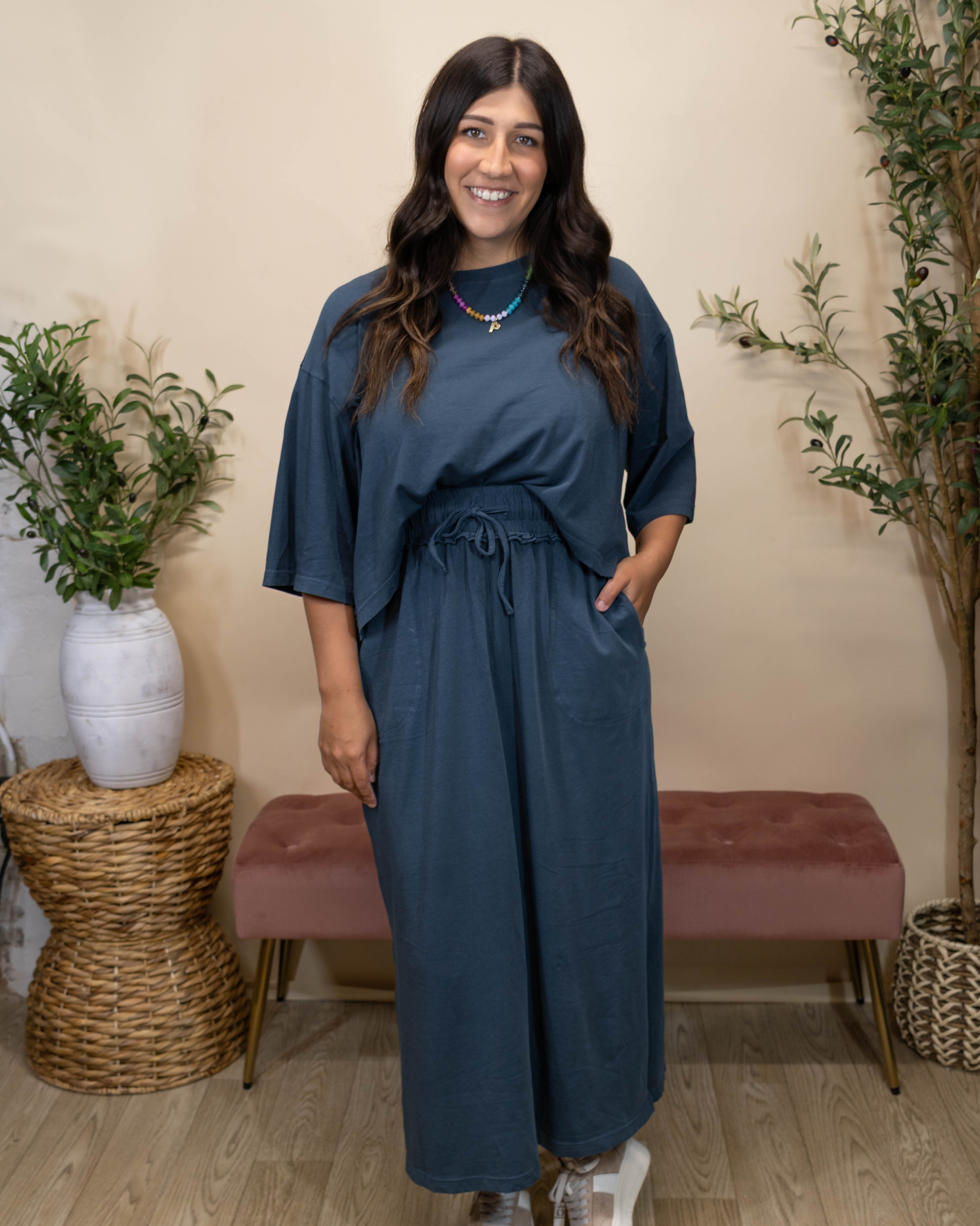 Elevate your wardrobe with the Since You're Gone Set in navy blue. Featuring a comfortable elastic waistband with a drawstring for a perfect fit, this set includes a skirt with a subtle side slit and practical pockets. The crew neckline adds a classic touch, making it ideal for both casual outings and stylish gatherings. Experience effortless style and comfort all day long.