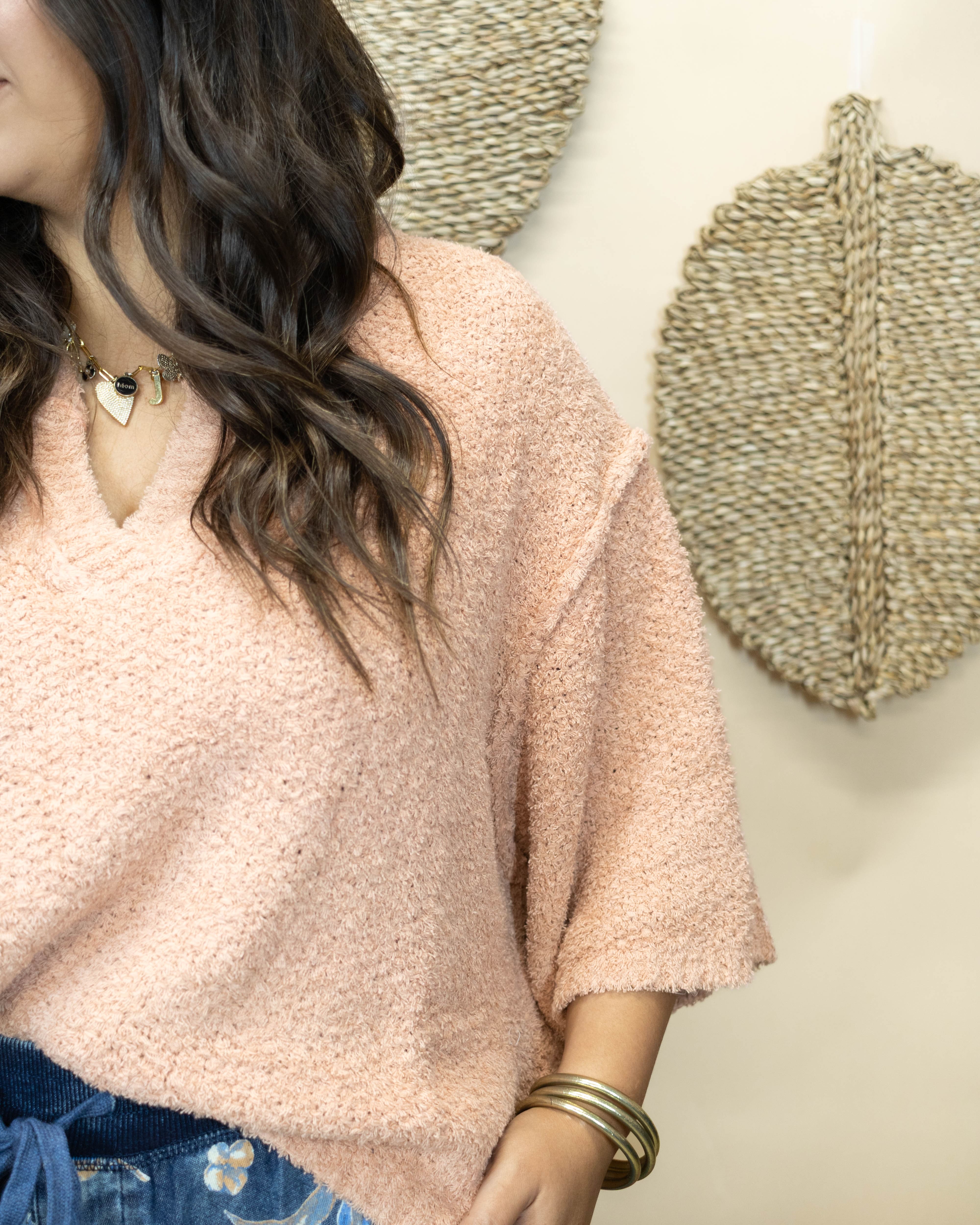 Embrace cozy sophistication with the Slide On By Sweater. Featuring a warm, heavy knit in a soft salmon hue, its flattering V-neck and high-to-low hemline create an effortlessly stylish silhouette perfect for cooler days. This sweater combines comfort and elegance, making it a versatile addition to your fall and winter wardrobe.