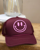 Add a playful touch to your look with this burgundy Smiley Trucker Hat. Featuring a vibrant smiley face design, it combines casual style with cheerful vibes. Its breathable mesh back keeps you cool, while the adjustable snap closure ensures a comfortable fit. Perfect for outdoor adventures or everyday wear, this hat brightens any outfit with a fun, laid-back flair.