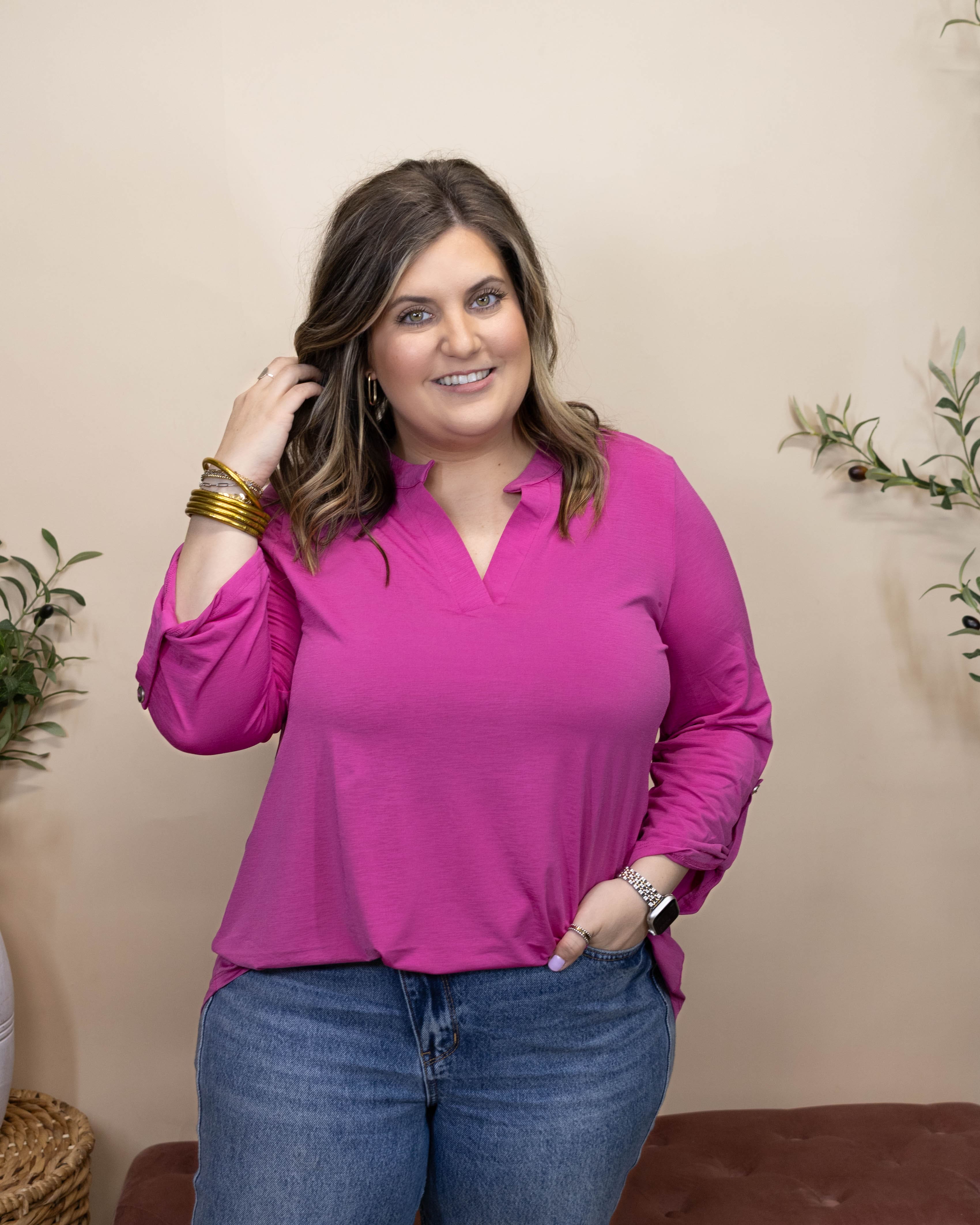 Elevate your work wardrobe with The Lizzy Top in Magenta. Designed with a mock collar and flattering 3/4 sleeves, this top offers a polished look that stays crisp throughout your busy day. It washes well and resists wrinkles, ensuring you always look professional with minimal effort. Perfect for the office or any occasion where you want to feel confident and comfortable.