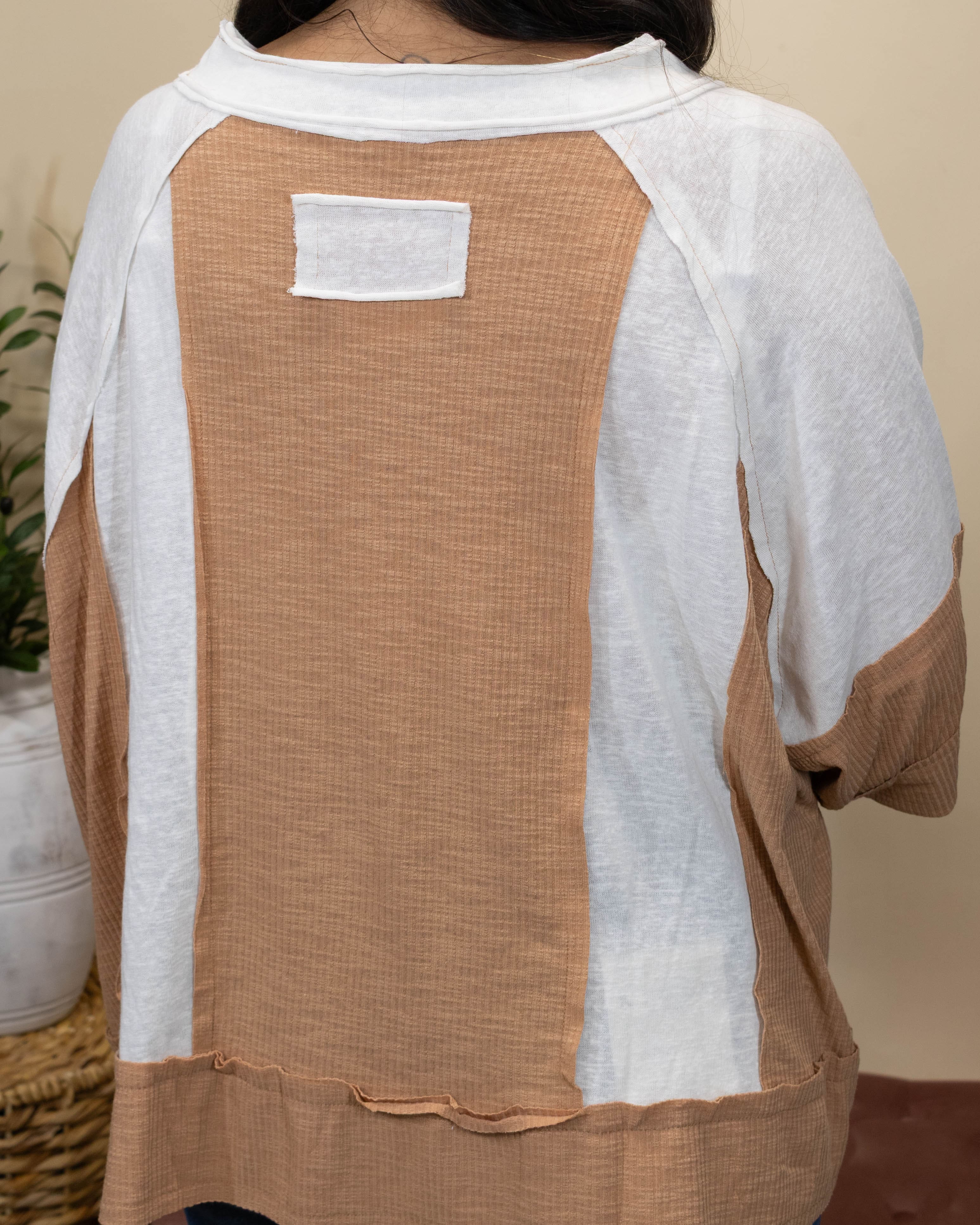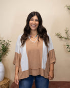 The Through The Years Top features a lightweight, sheer fabric in a sophisticated white and camel color palette. Its loose fit and V neckline offer effortless comfort and style, while the angled hemline adds a modern, flattering touch. Perfect for layering or wearing on its own, this top brings a breezy elegance to any outfit.