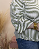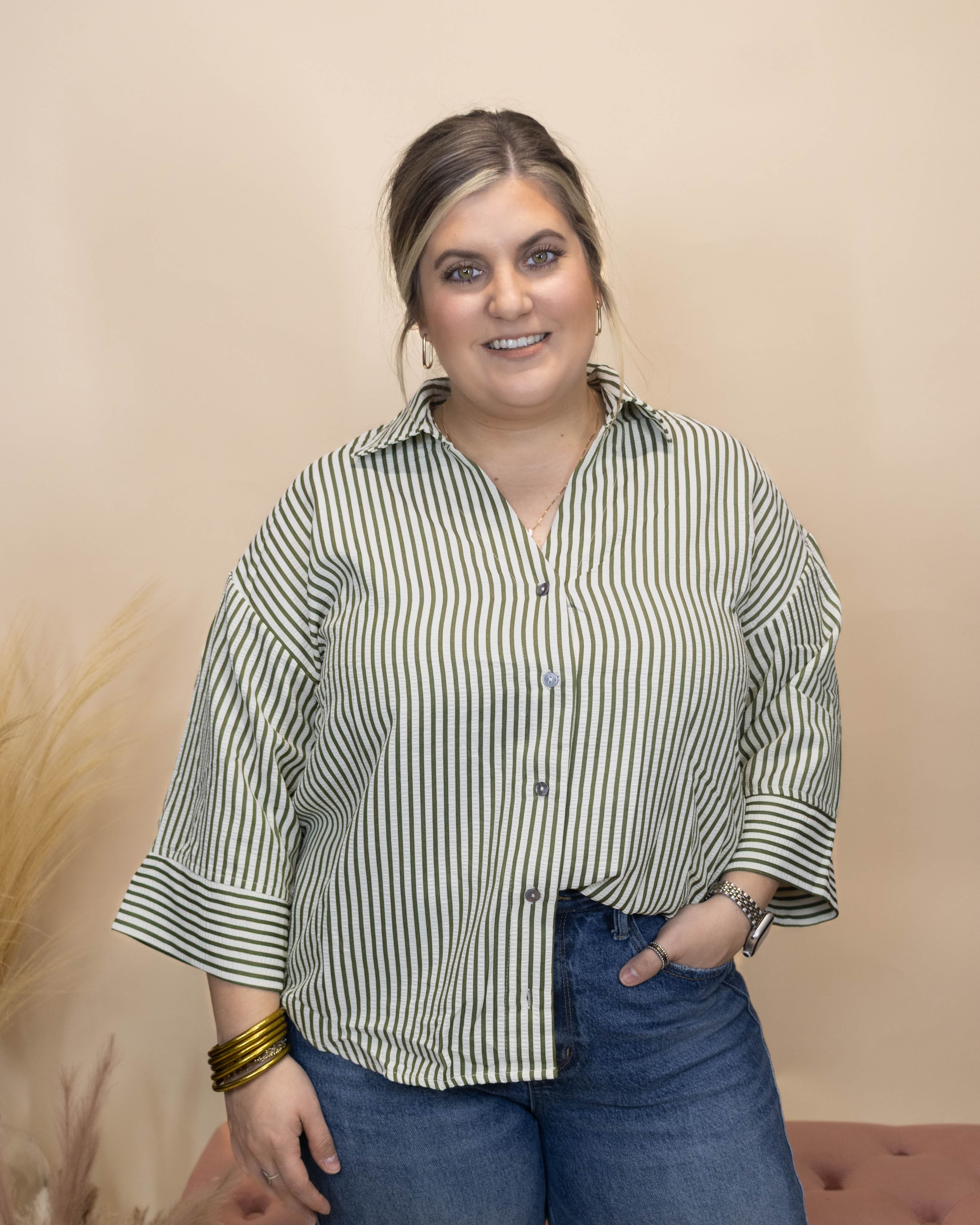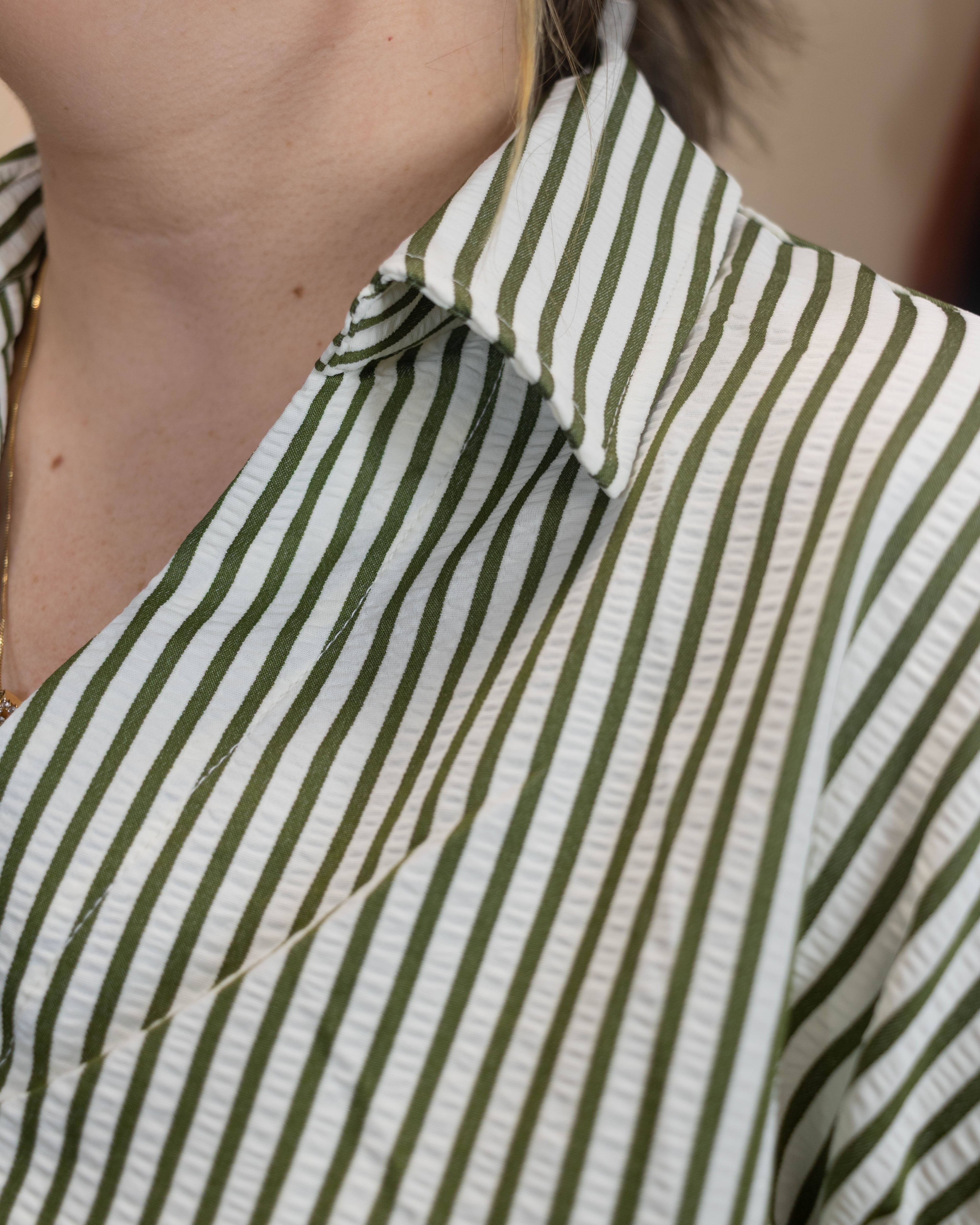 Experience comfort and style with the Touch of You Top, crafted from lightweight, breathable textured fabric. Its delicate off-white and green thin stripes offer a fresh, natural look. Featuring a classic collar, wide midi sleeves, and button details, this top blends effortless elegance with relaxed comfort—ideal for any season or occasion.