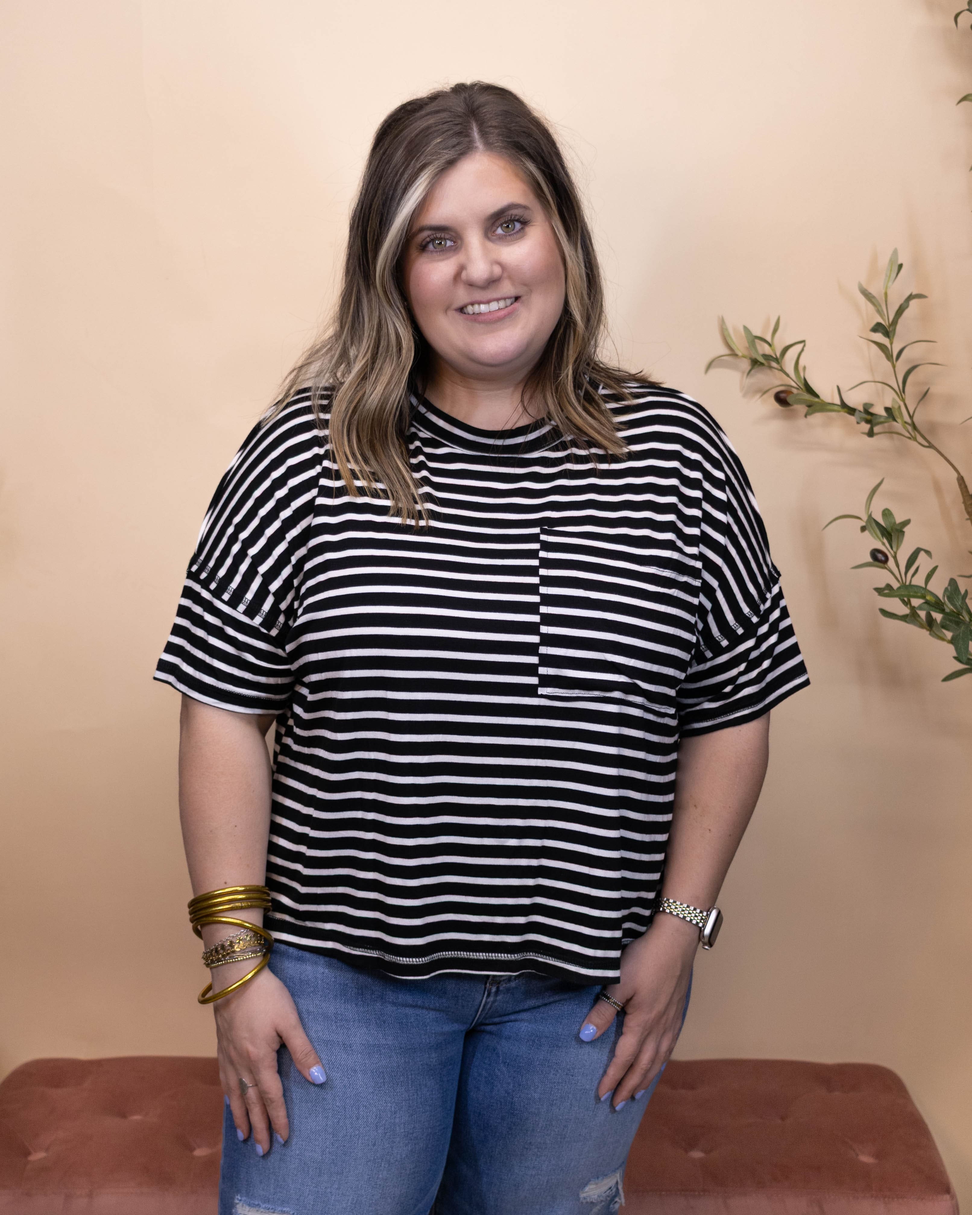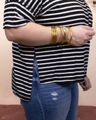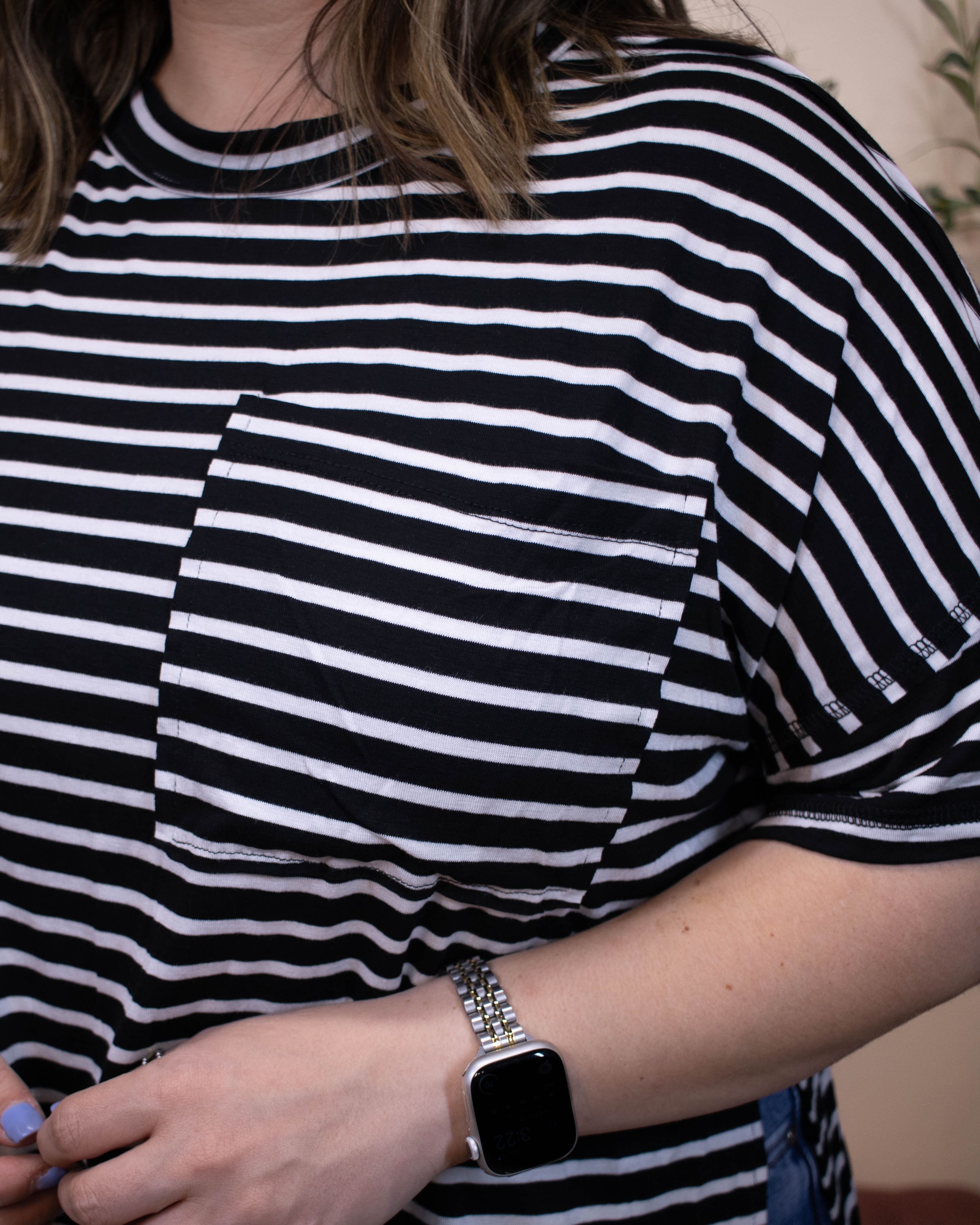 The True Intentions Top offers a buttery soft feel with classic black and white stripes for timeless style. Its crew neck and side slit add subtle details that enhance comfort and movement, making it an effortlessly chic choice for everyday wear.