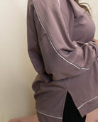The Where The Day Goes Pullover in muted purple features a V neckline with a raw hem and collar, accented by crisp white trim for a subtle yet striking contrast. Cuffed wristbands provide a comfortable, secure fit, making this pullover a stylish and cozy choice for any casual occasion.