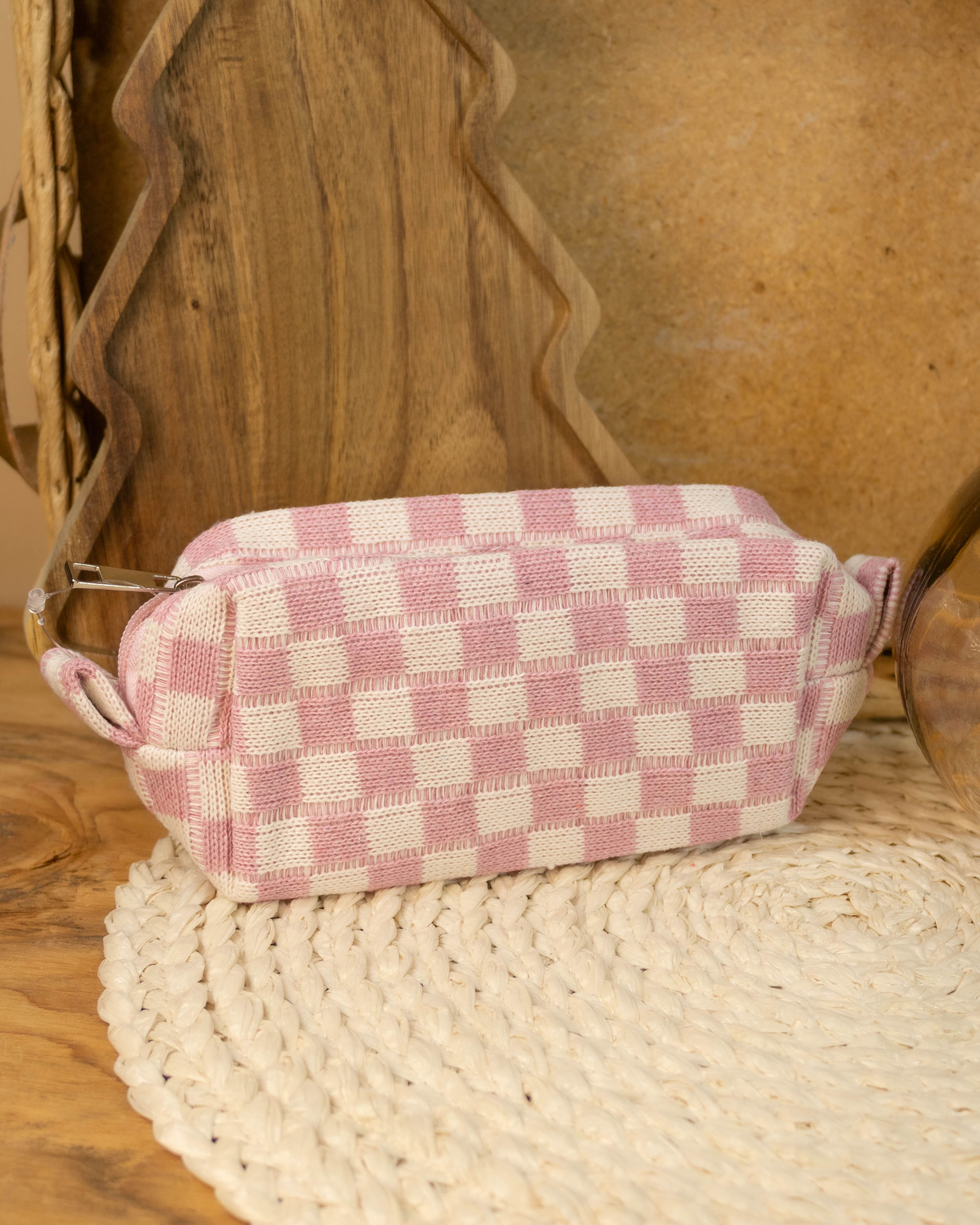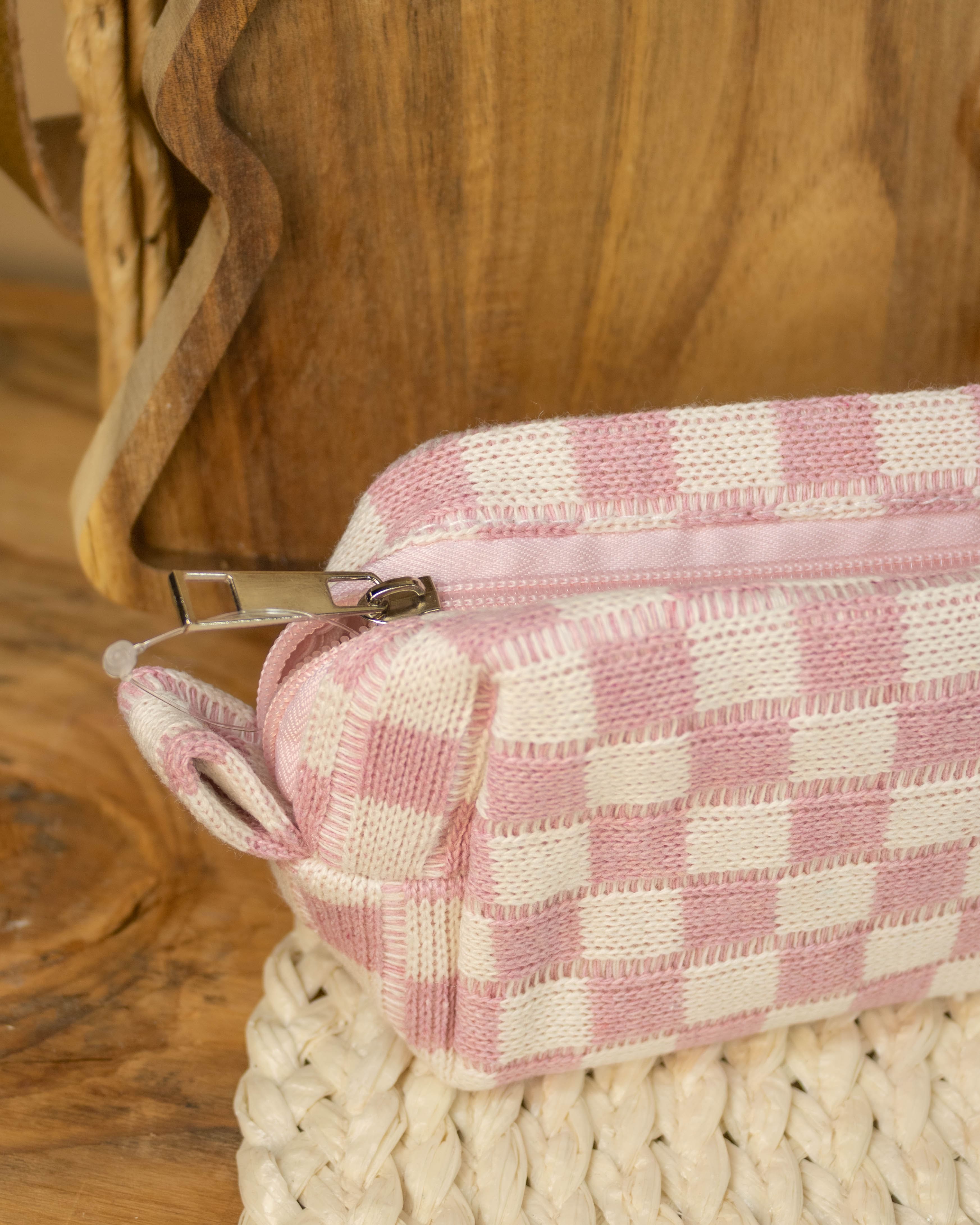 Checker Makeup Cosmetic Pouch- Light Pink