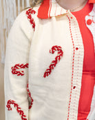 Embrace the festive spirit with our Candy Cane Lane Sweater, a charming holiday essential that brings warmth and whimsy to your seasonal wardrobe. This striking white and red design features eye-catching candy cane detailing along the front and back, creating a playful statement piece that captures the magic of the season. The flattering V-neckline adds a touch of sophistication while keeping the look fun and approachable. Perfect for holiday gatherings, cozy nights in, or spreading cheer wherever you go, this sweater combines comfort with unmistakable festive flair that'll have everyone in the holiday spirit.