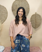 Embrace cozy sophistication with the Slide On By Sweater. Featuring a warm, heavy knit in a soft salmon hue, its flattering V-neck and high-to-low hemline create an effortlessly stylish silhouette perfect for cooler days. This sweater combines comfort and elegance, making it a versatile addition to your fall and winter wardrobe.