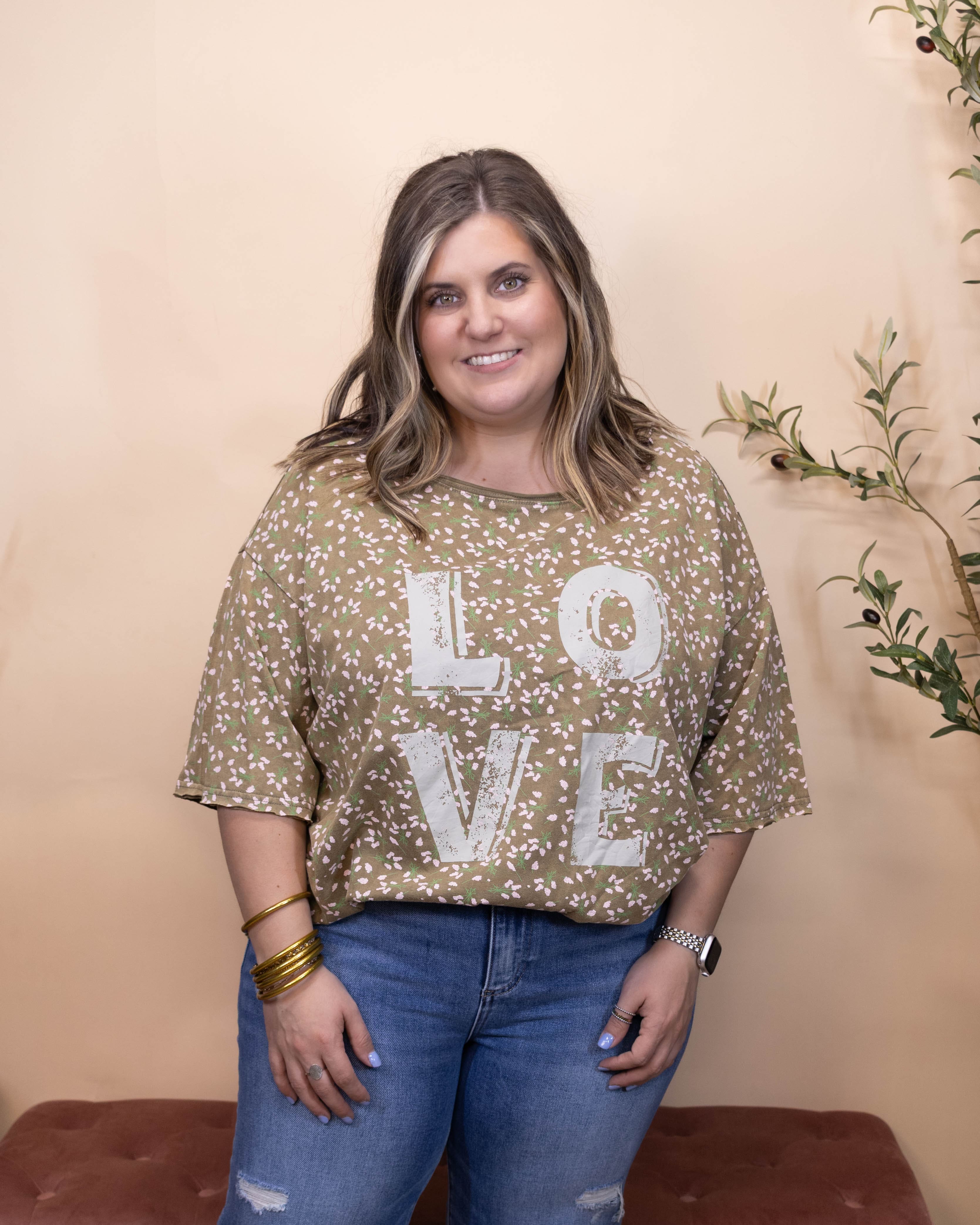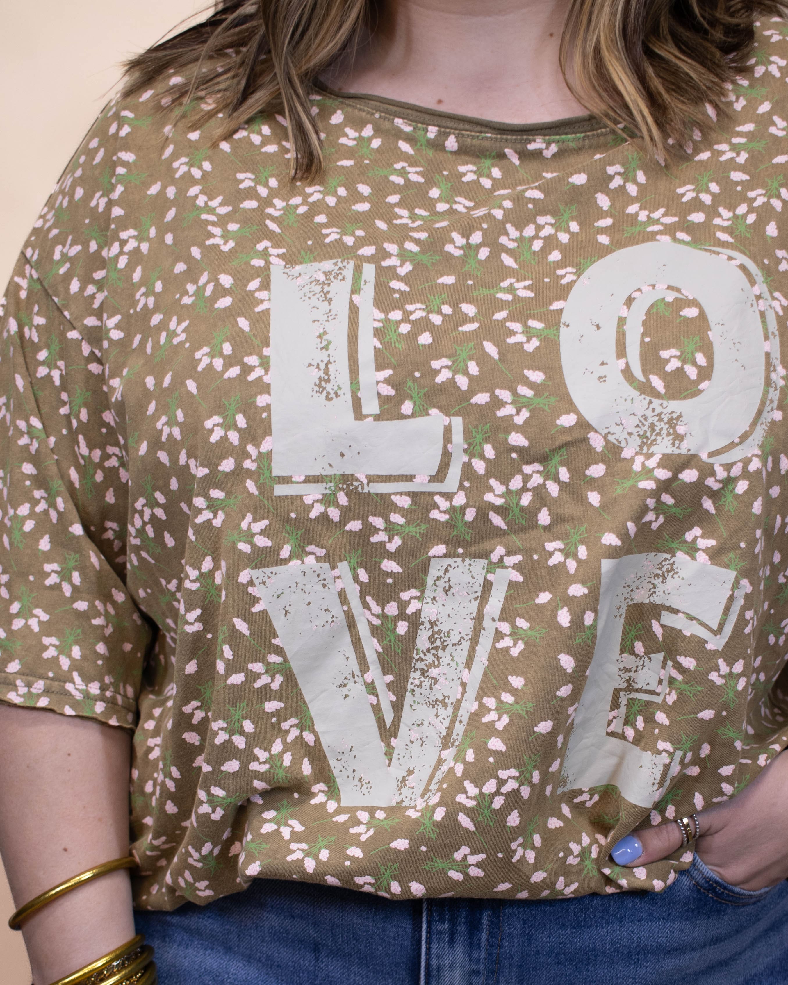 The All In Love Top showcases a warm brown background adorned with delicate pink flowers and subtle green accents, creating a soft, romantic vibe. Featuring a distressed "love" graphic, this top blends vintage charm with modern style, making it a perfect choice to express your affectionate spirit with a trendy edge.