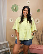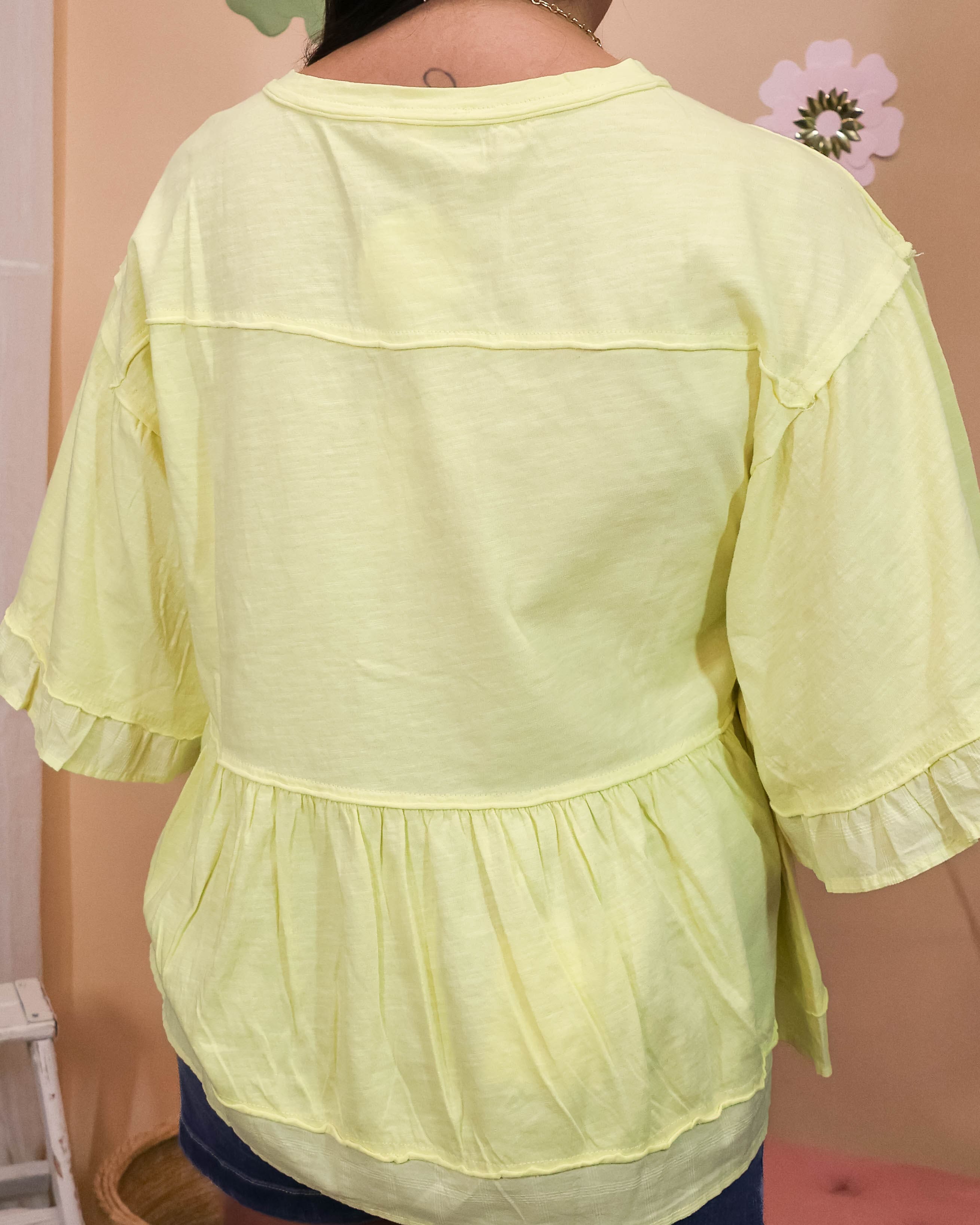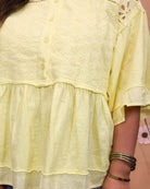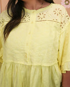 Playful and pretty, this pastel yellow top brings instant charm to your wardrobe. The babydoll silhouette drapes effortlessly while ruffled details add flirty movement, and eyelet-cut flowers create delicate openwork that's both romantic and fun. Lightweight and breathable, it's designed for those days when you want to feel put-together without any fuss.